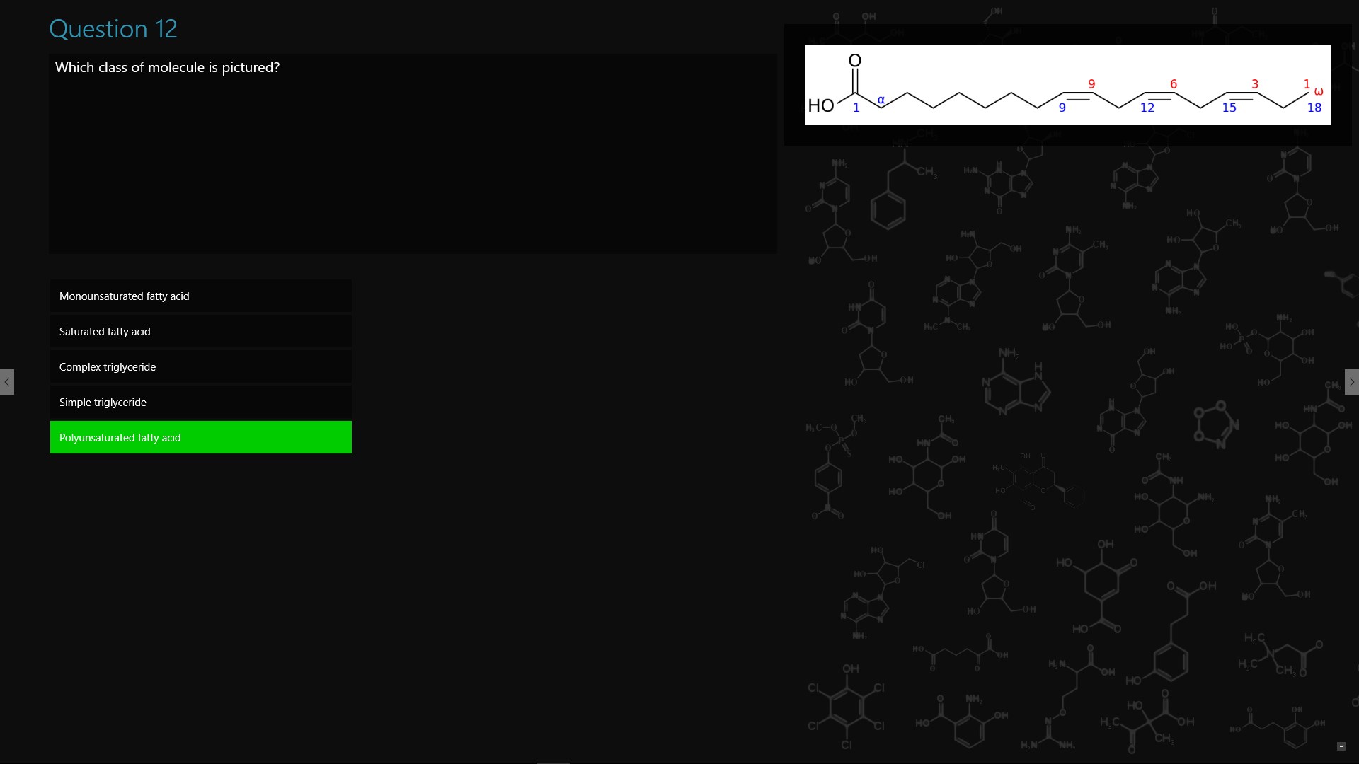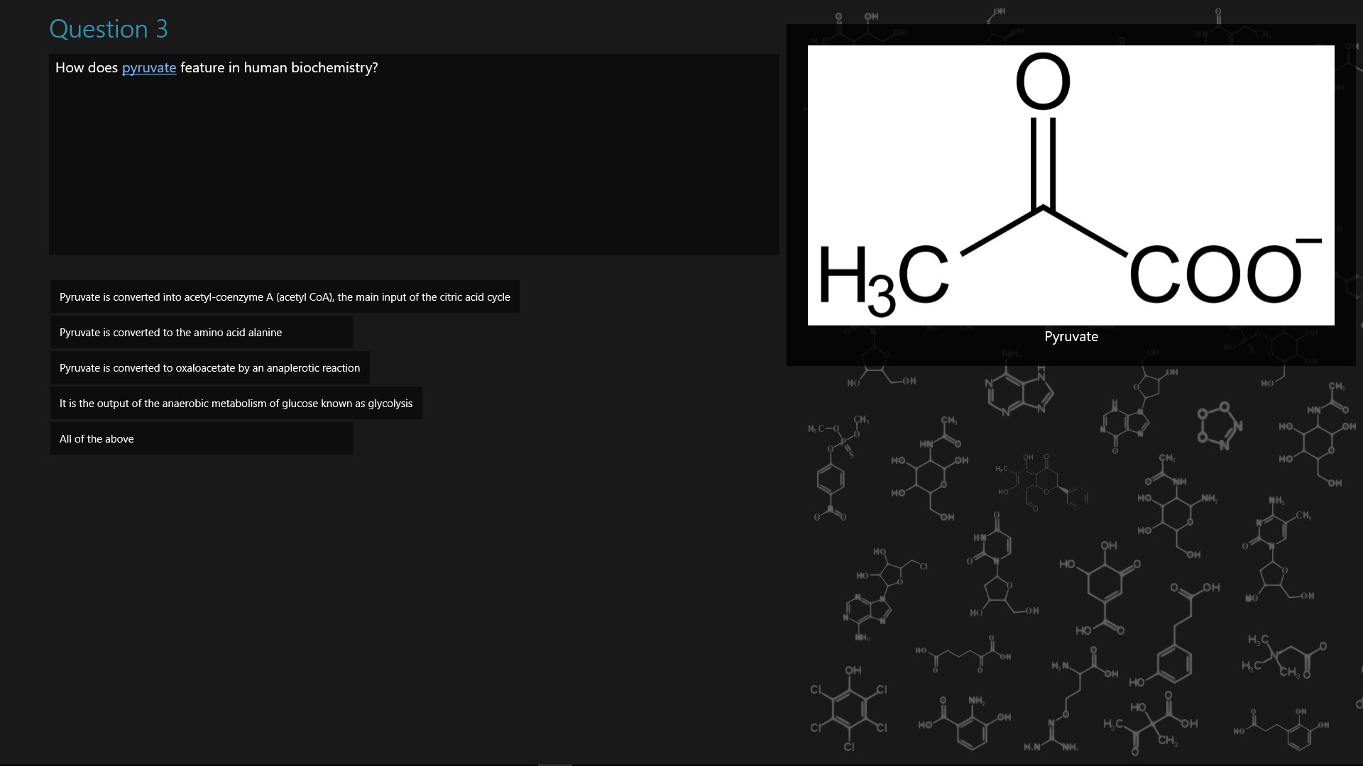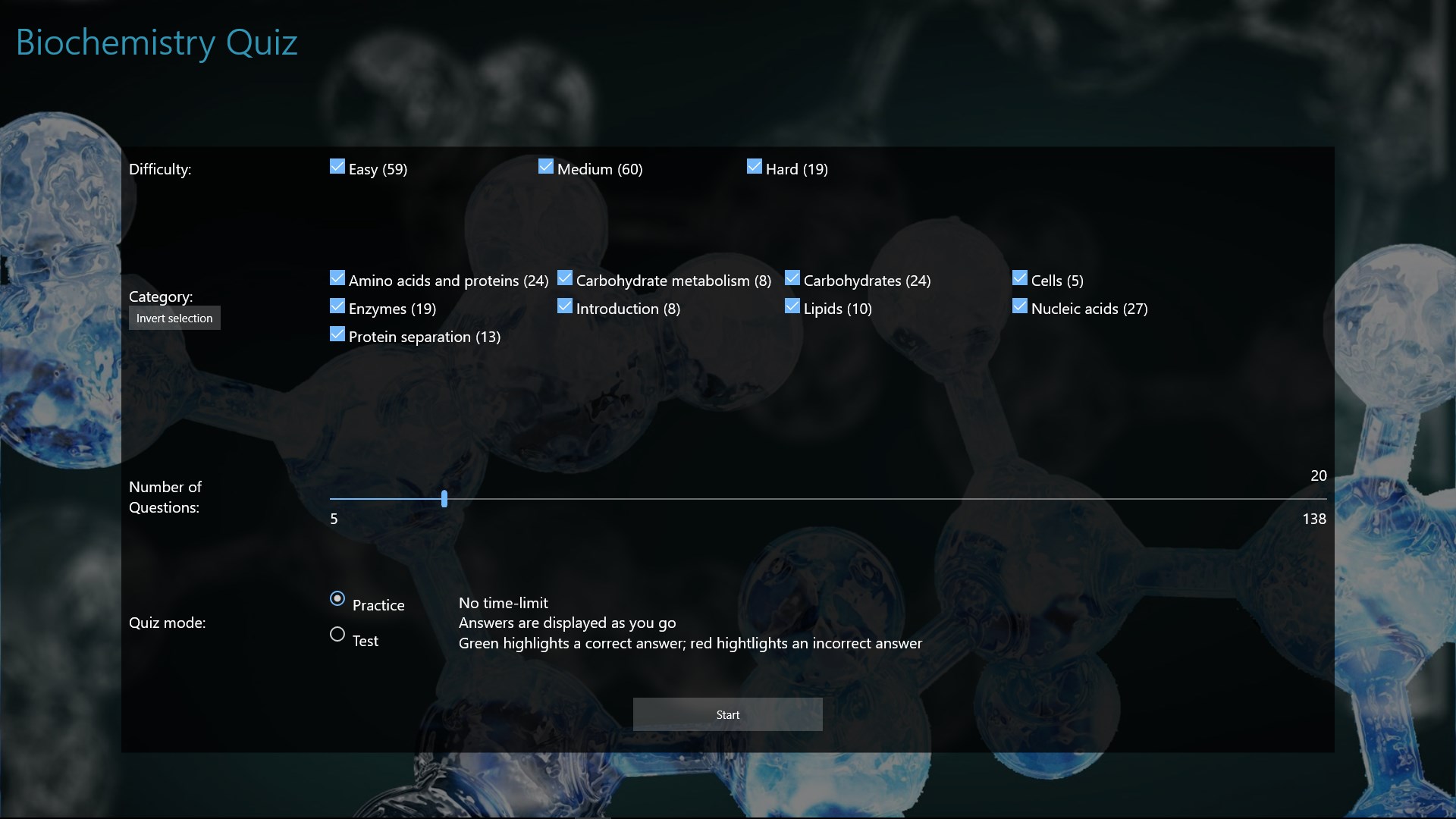 Test your knowledge of biochemistry; covering carbohydrates, proteins, enzymes and nucleic acids. Questions are categorised and have a difficulty level. There are over 130 questions.