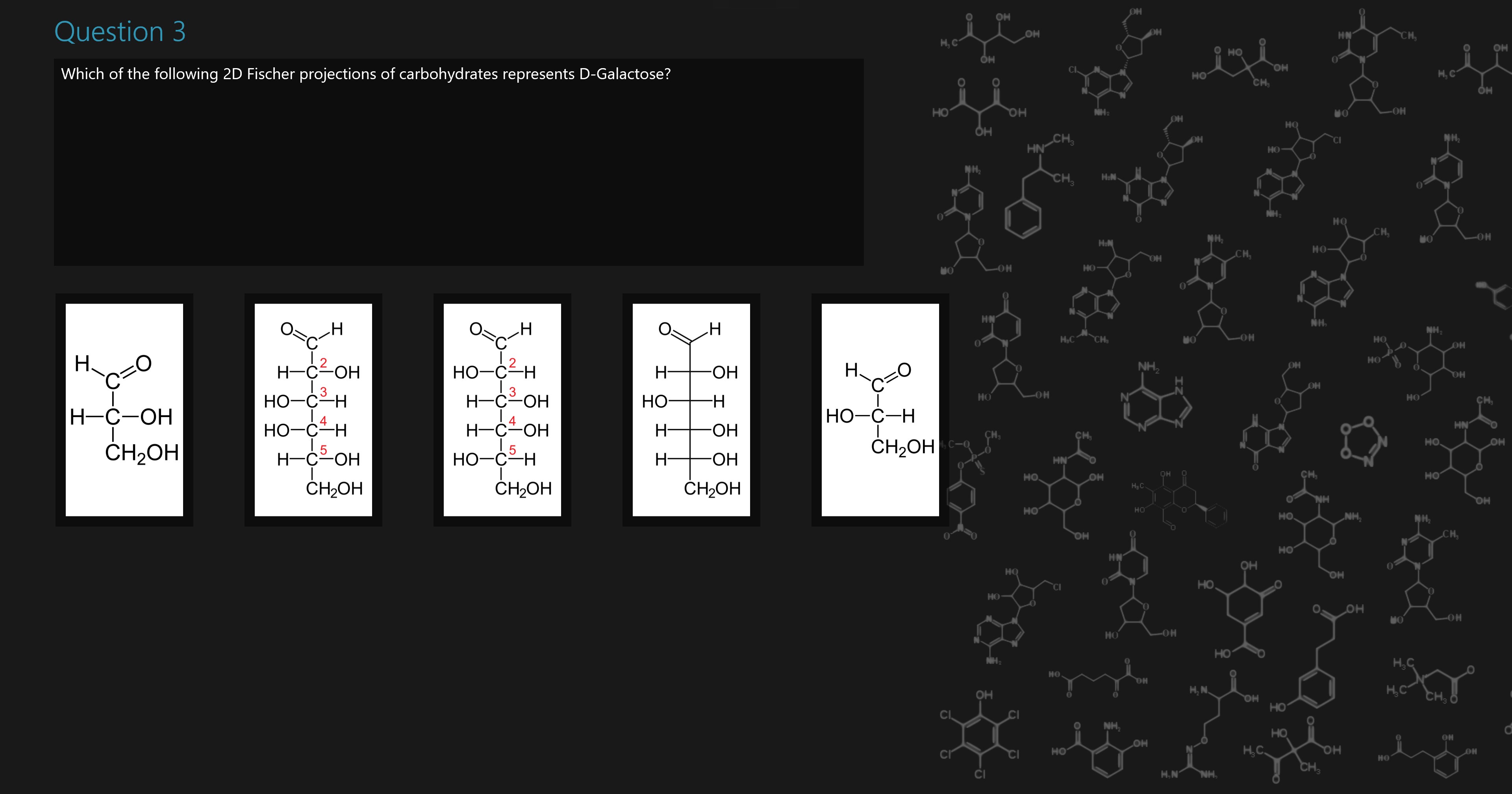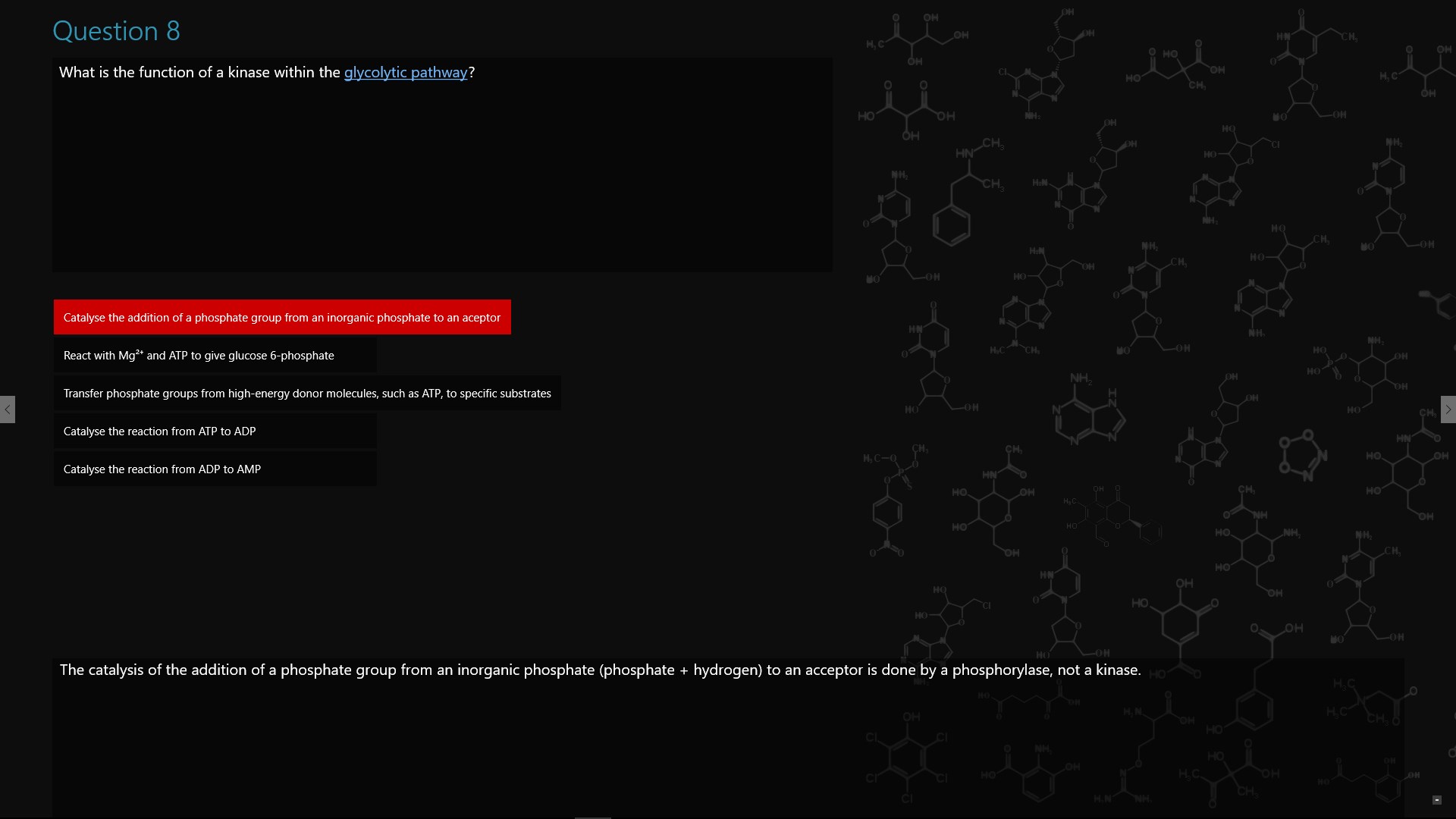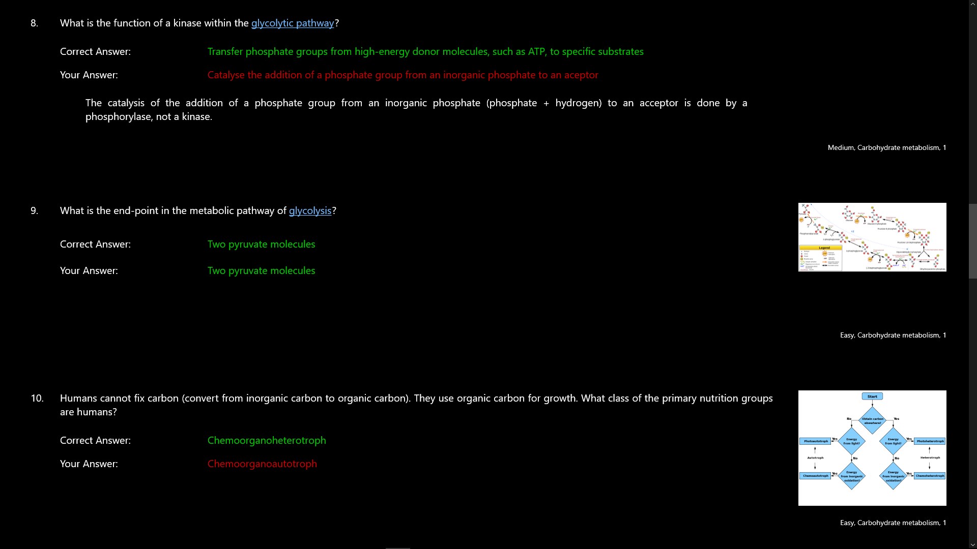 Test your knowledge of biochemistry; covering carbohydrates, proteins, enzymes and nucleic acids. Questions are categorised and have a difficulty level. There are over 130 questions.