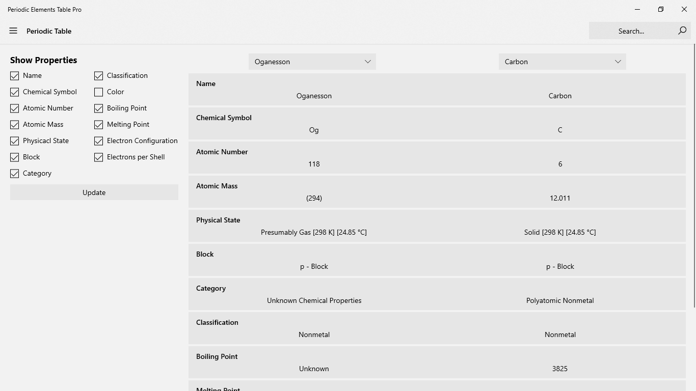 Utilizing the Fluent Design SystemZooming featureFilter the elements color according to the classificationFilter the color of the elements based on the blockFilter the elements color by element categoryFilter the color of the elements based on the physical stateSearching elementsList of elements that orders by they\'re numbers Compare two elementsLimit the shown properties of comparing the two elementsSee the features of an element in the program itself or in WikipediaDisplaying the basic features of an element (atomic number, mass number, ...)Displays the physical state in two Celsius and Kelvin degreesClassification display (metal, metal and non-metal)Displaying images of each element (typically 3 images)Display the melting and boiling temperature of each elementHistory of each elementThe graphic view of an atom with its electronsView Electron ConfigurationDisplay the number of electrons per shell