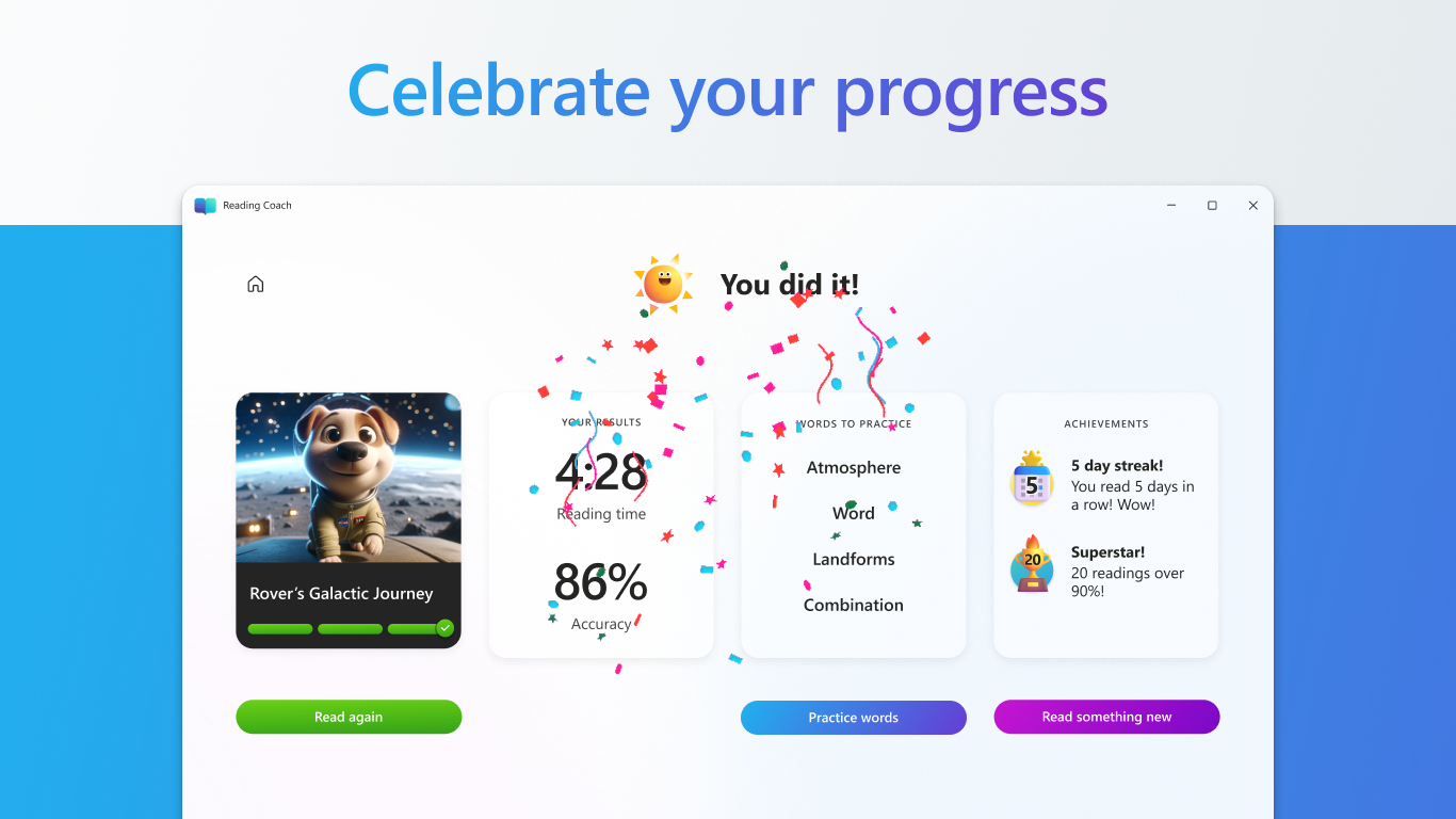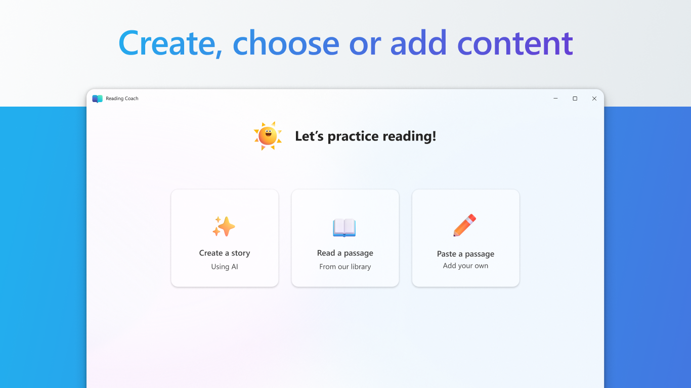 Reading Coach is a practice tool for anyone looking to build their literacy skills. With the power to generate stories with AI and a library of leveled passages from ReadWorks, learners can practice reading with content that matches their abilities and interests. Reading Coach keeps learners engaged with opportunities to unlock new characters and settings, practice their most challenging words, and track their progress over time. The application works for learners who know how to decode words.