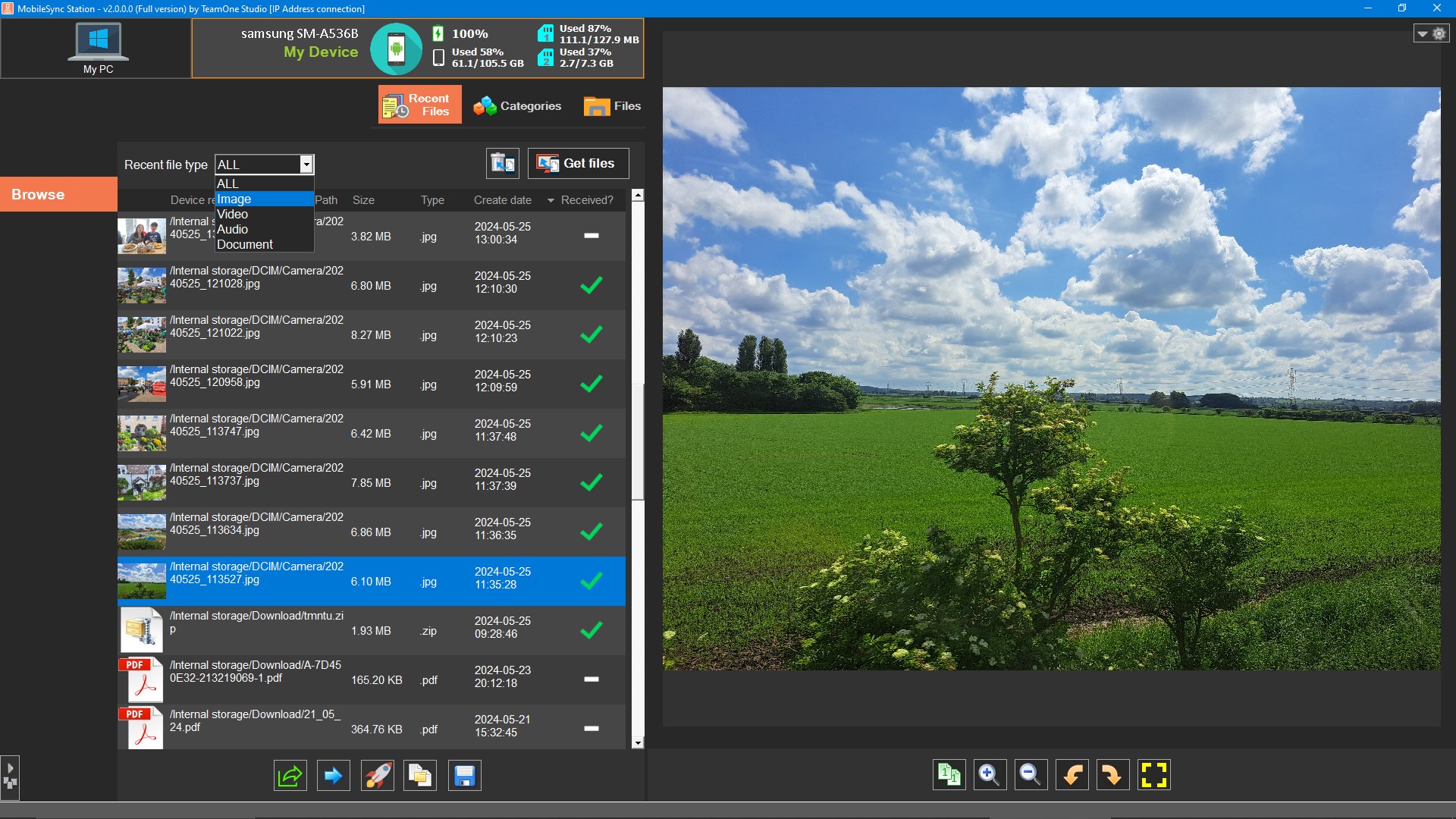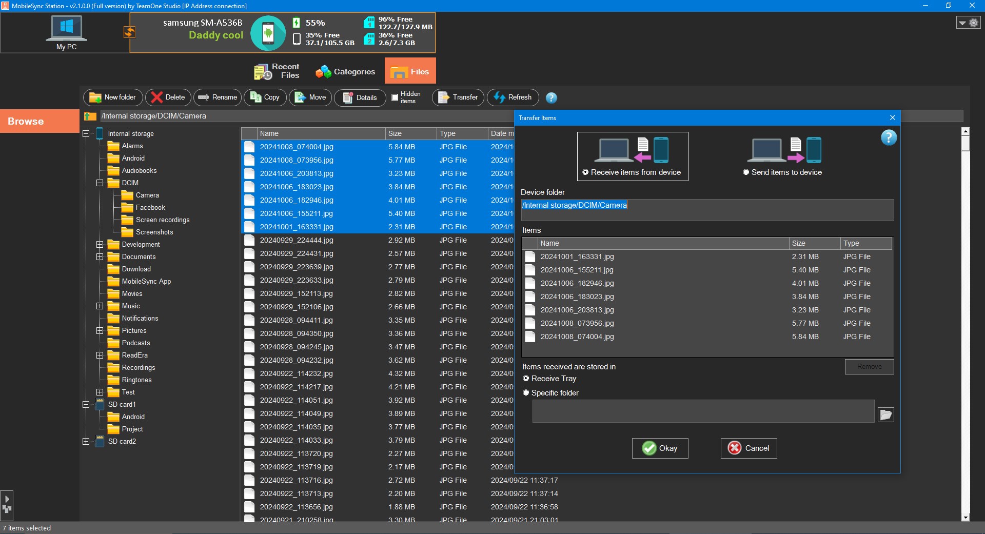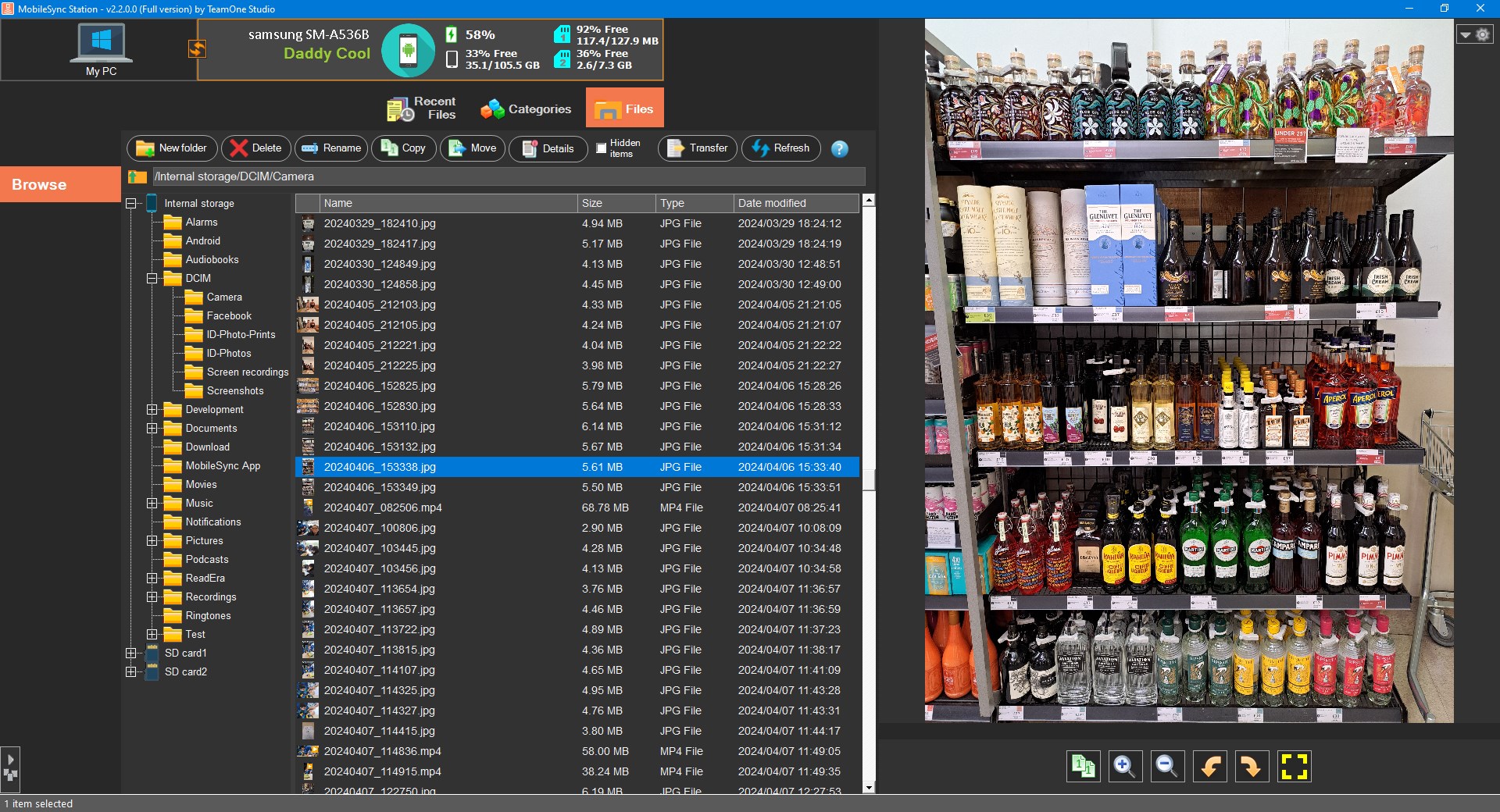 Utilize the built-in device file explorer to wirelessly access and manage files on your mobile devices. Available file operations include COPY, MOVE, and DELETE functions, as well as advanced transfer options between PC and device folders.*