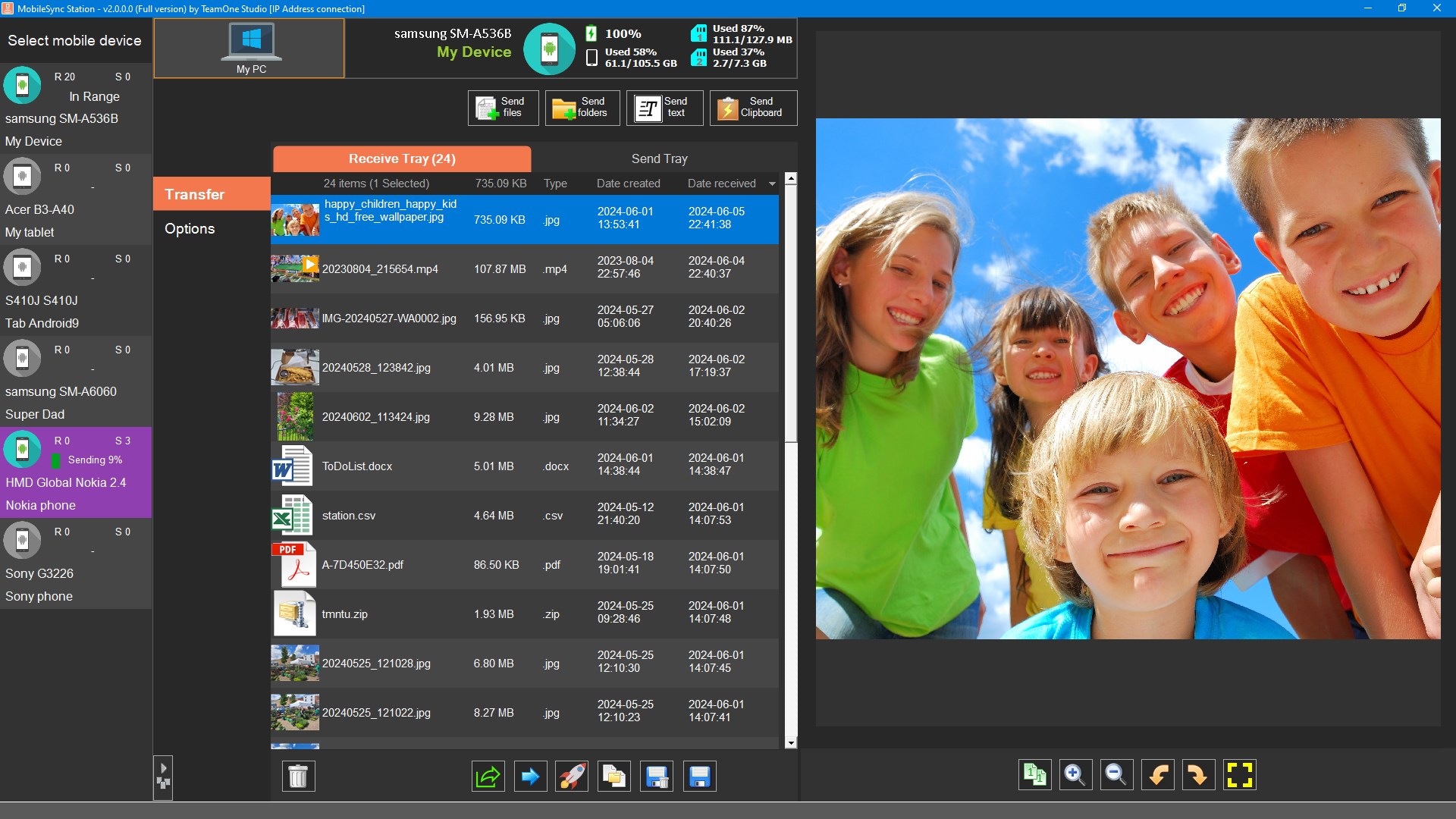 MobileSync Station for Windows allows you to access files on your Android phones or tablets via Wi-Fi within your local network. Key features include file and text transfer, automatic file synchronization, and instant previews of files stored on remote devices.