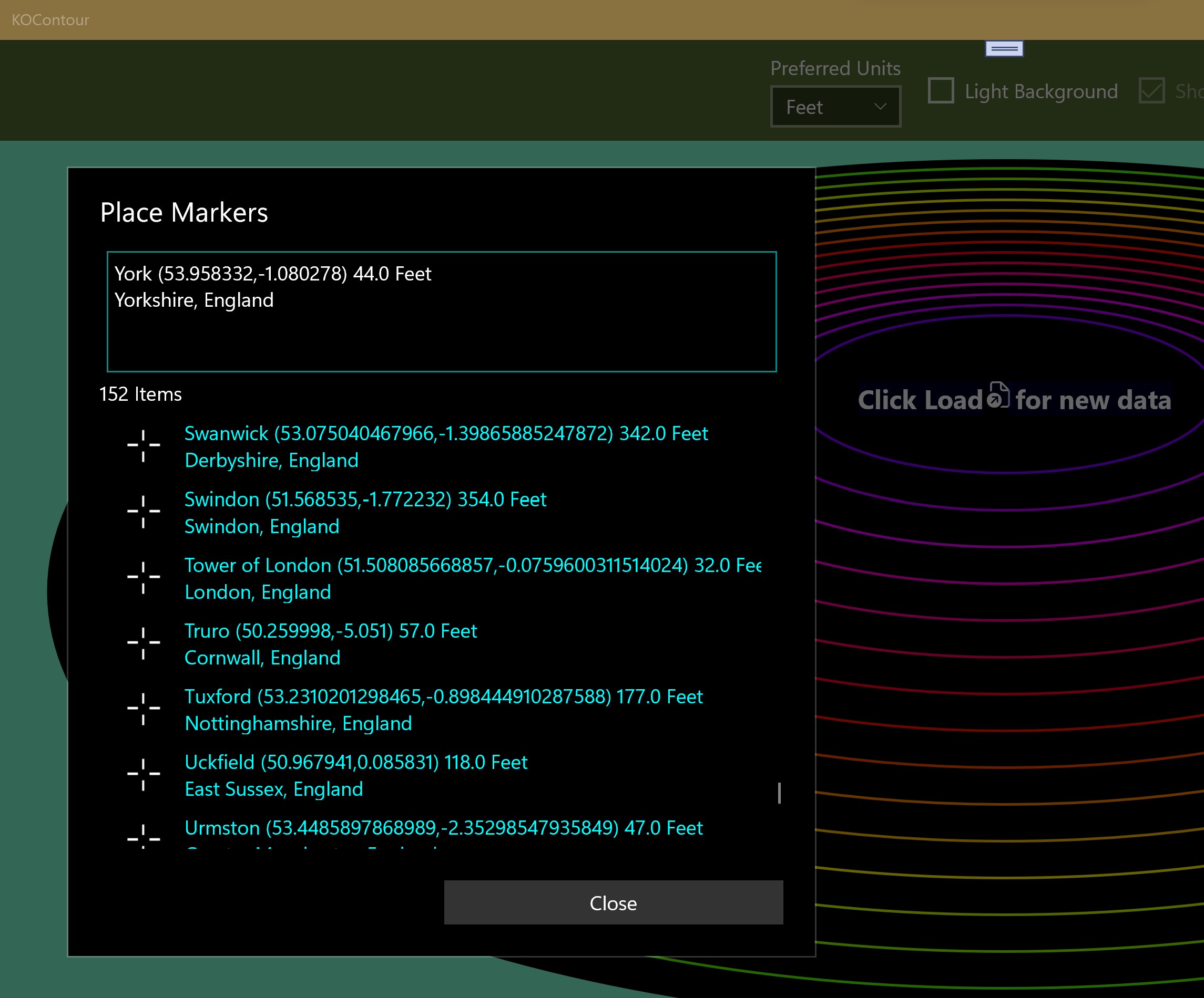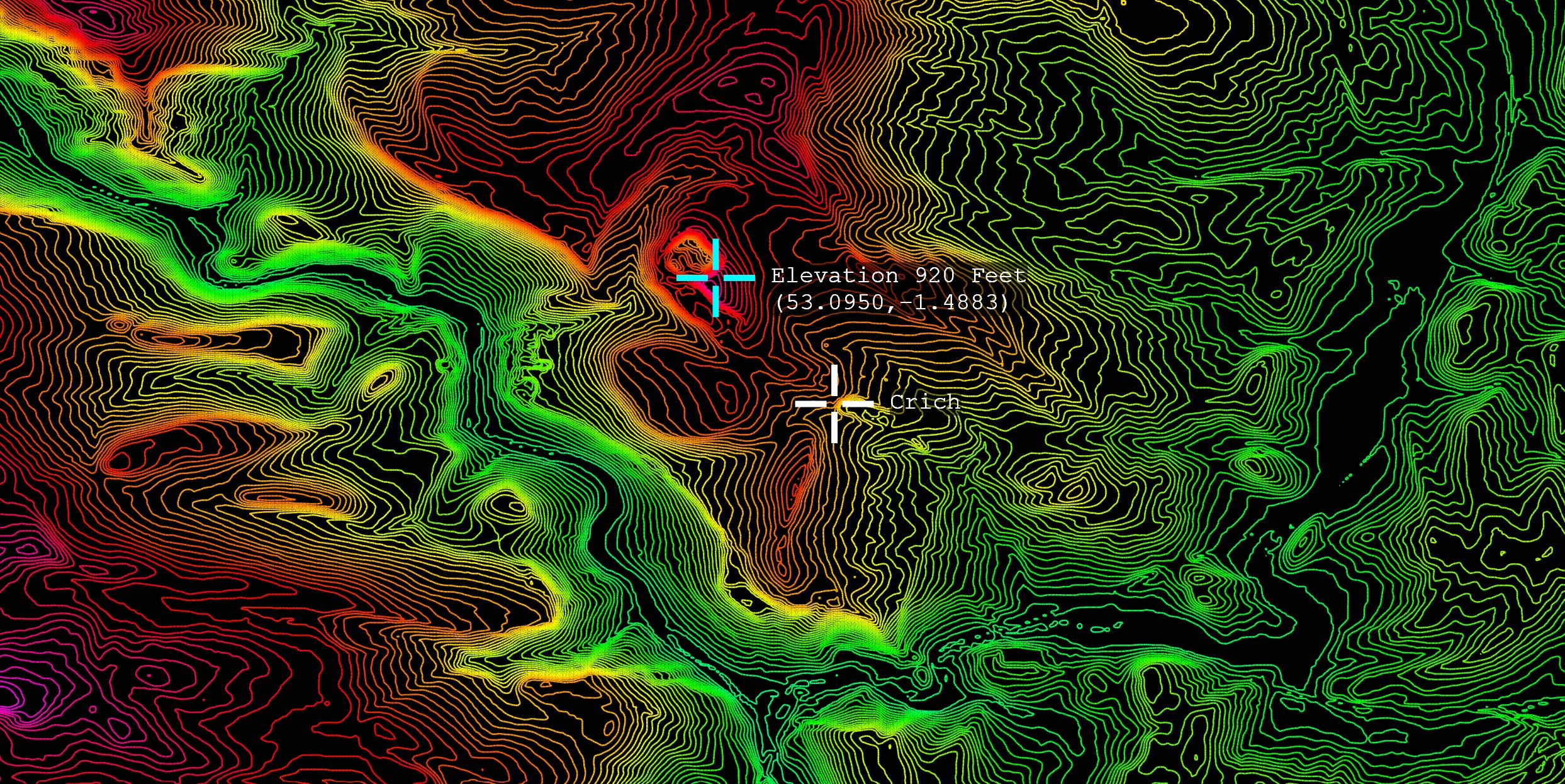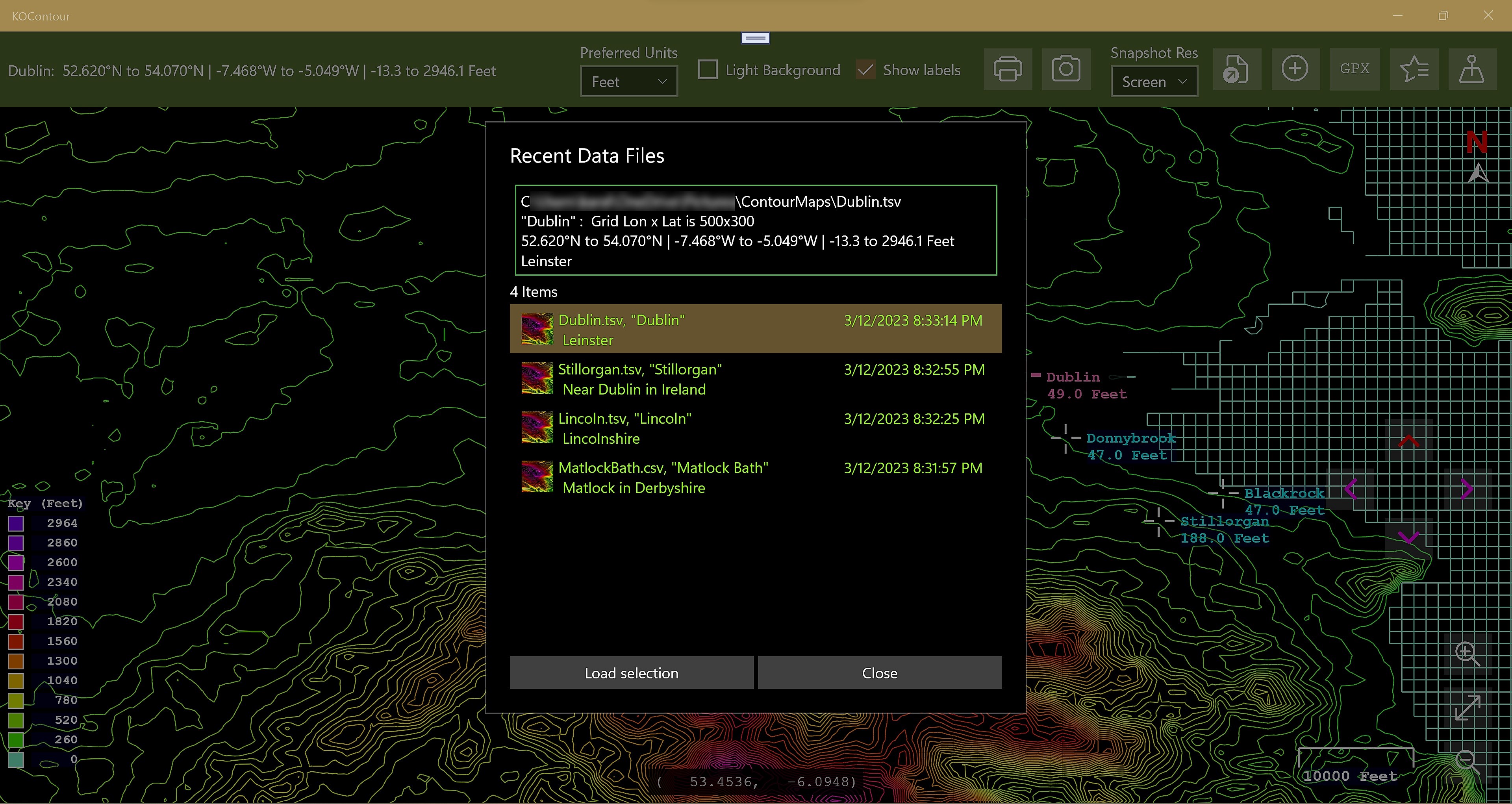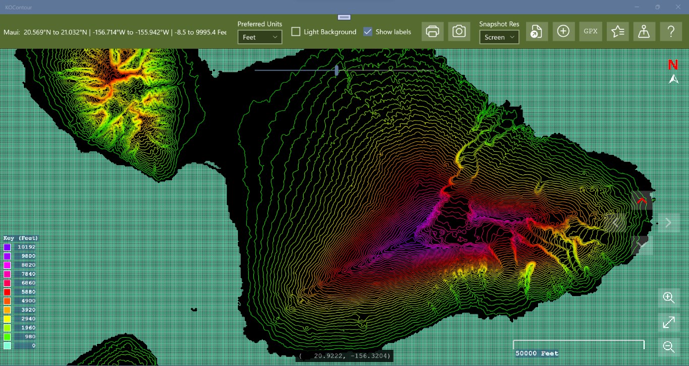 Display contours of latitude/longitude elevation data such as that produced by gpsvisualizer.com . Supports saving favourite data files, places, creating PNG snapshots, and GPX files. Supports tab and comma separated input data files, and detects the input data format provided it has column headers for latitude, longitude, and altitude, and optionally name, and desc.