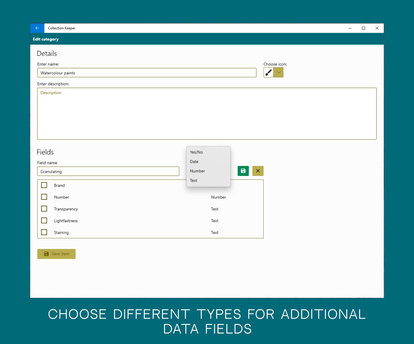 - You can configure fields of properties in each category to store specific data of your collected items such as author, price, date, etc. You will chose what data to store and what fields to create. Fields have several types like text, number or date.