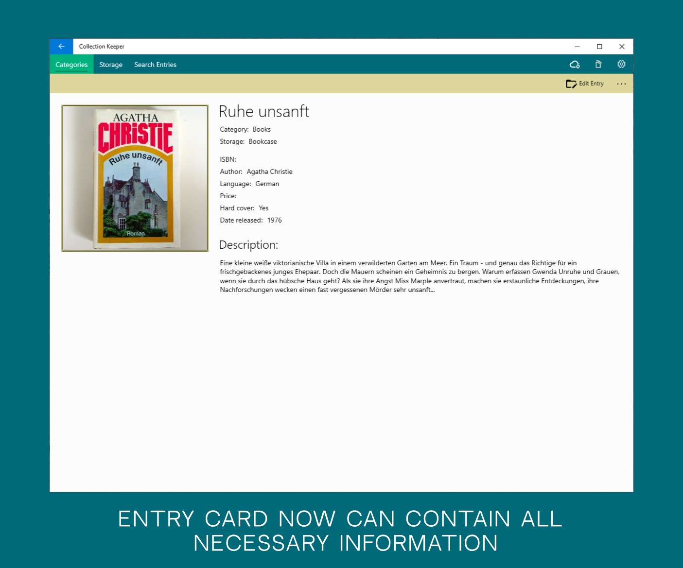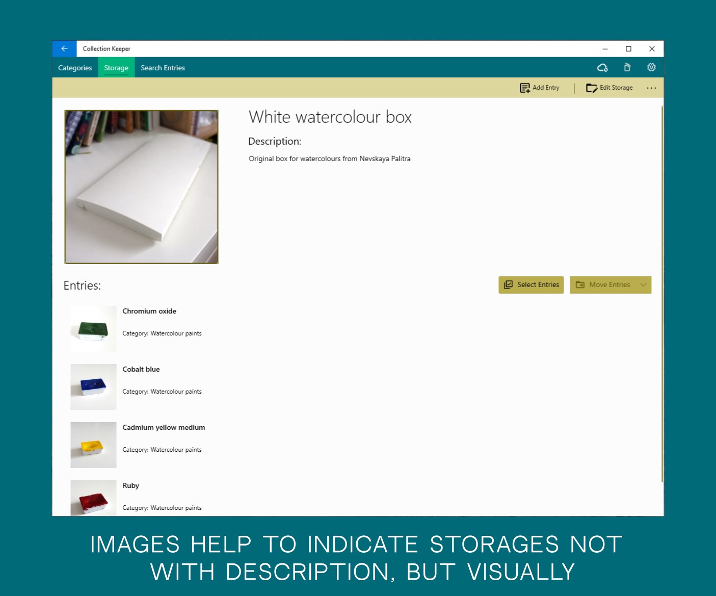 store collectionsassign pictures to each entrygroup entries by categoriesdescribe storages of collected itemsdata synchronizationassign custom properties for itemsrecycle bin for all kinds of entities