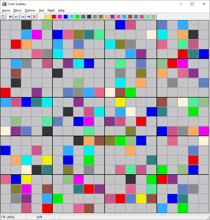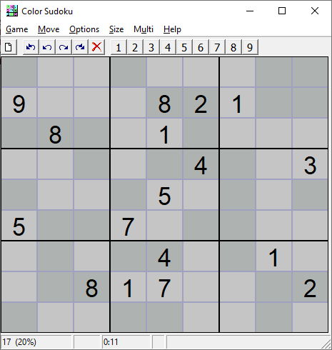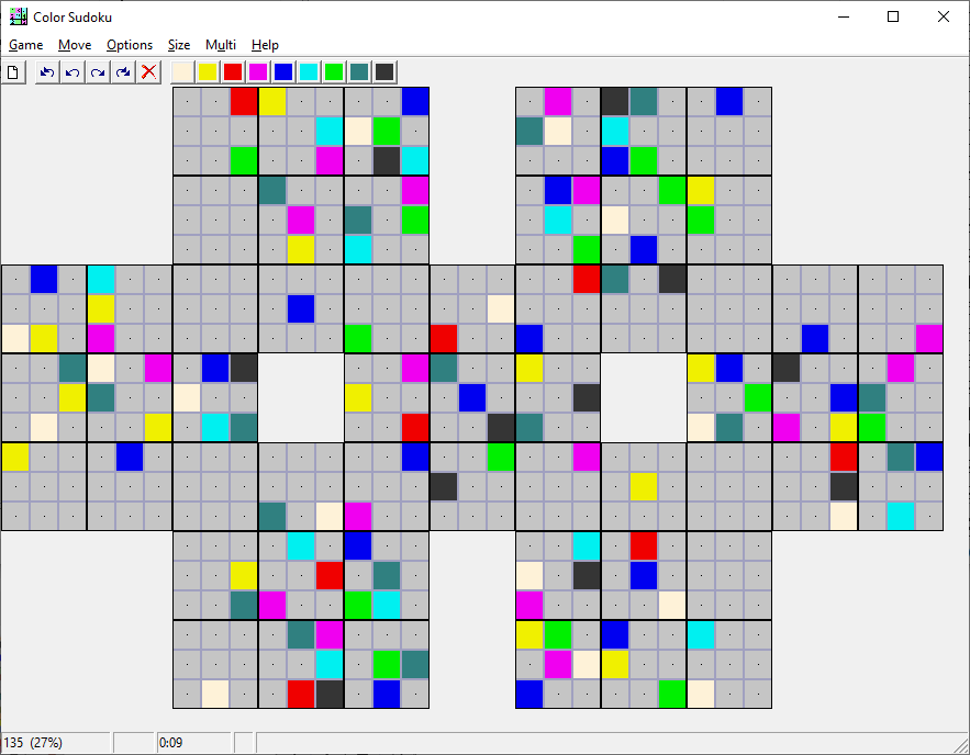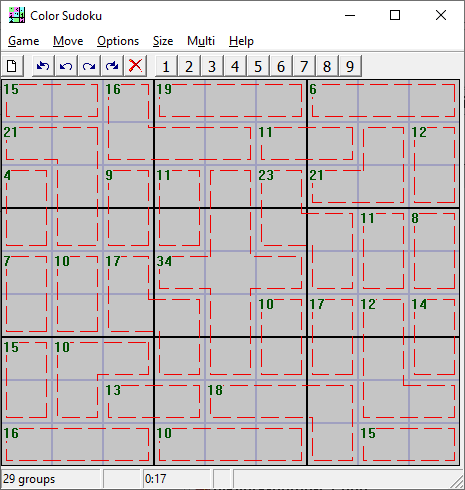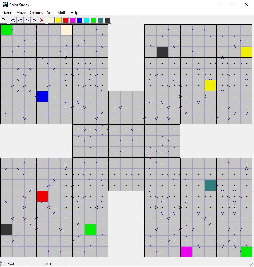 Many variants of Sudoku puzzle games - Odd/Even, Greater Than, Consecutive, Killer, Diagonal, Double, Triple, Butterfly, Flower, Windmill, Samurai. You can set the board size from 4 to 20 (standard size is 9). You can choose colors or letters instead of digits. Every puzzle has a unique solution. The right mouse button is used to draw pencil marks. This program also contains editor and solver and it can create a PDF file which has multiple sudoku per page.