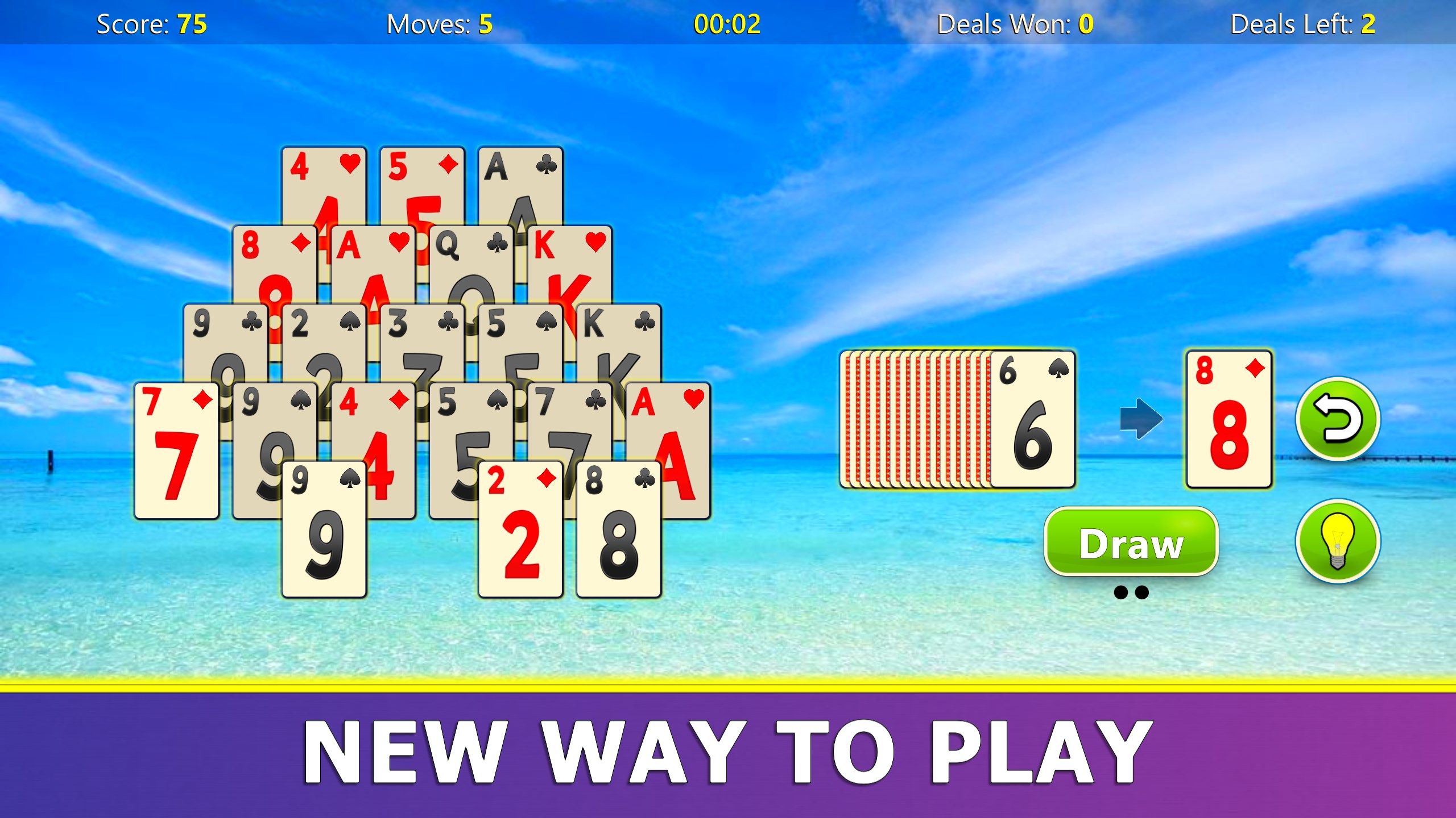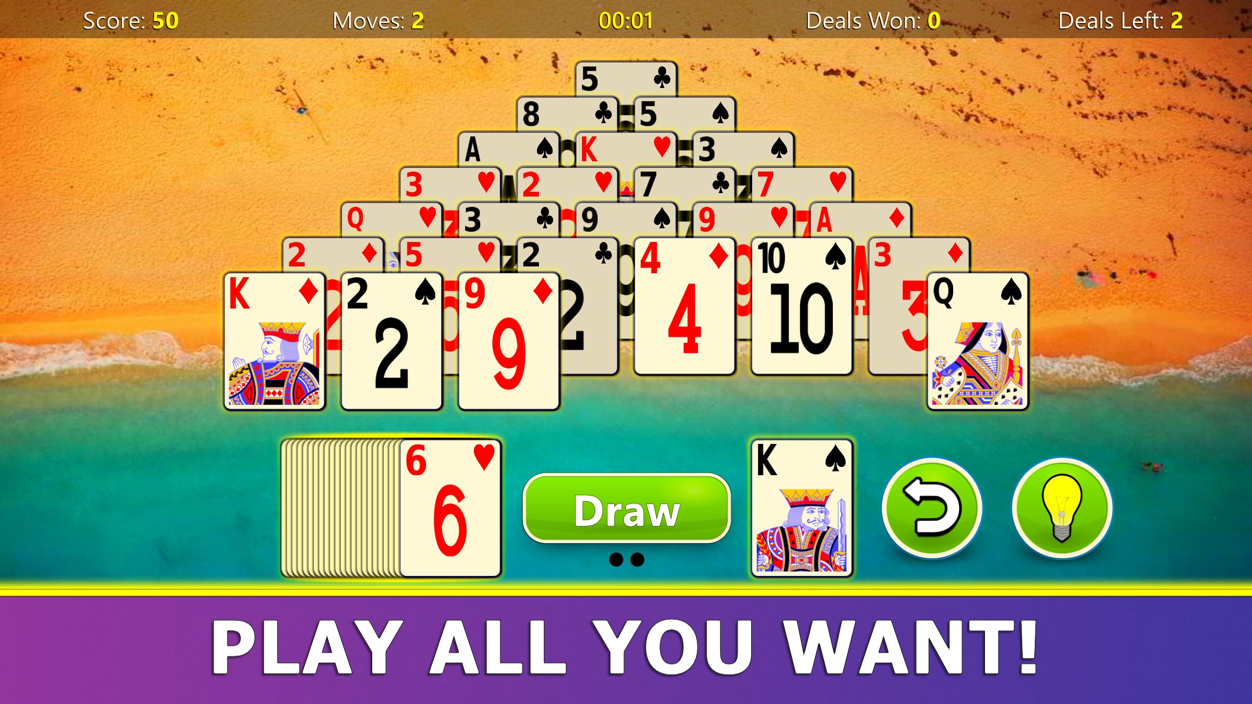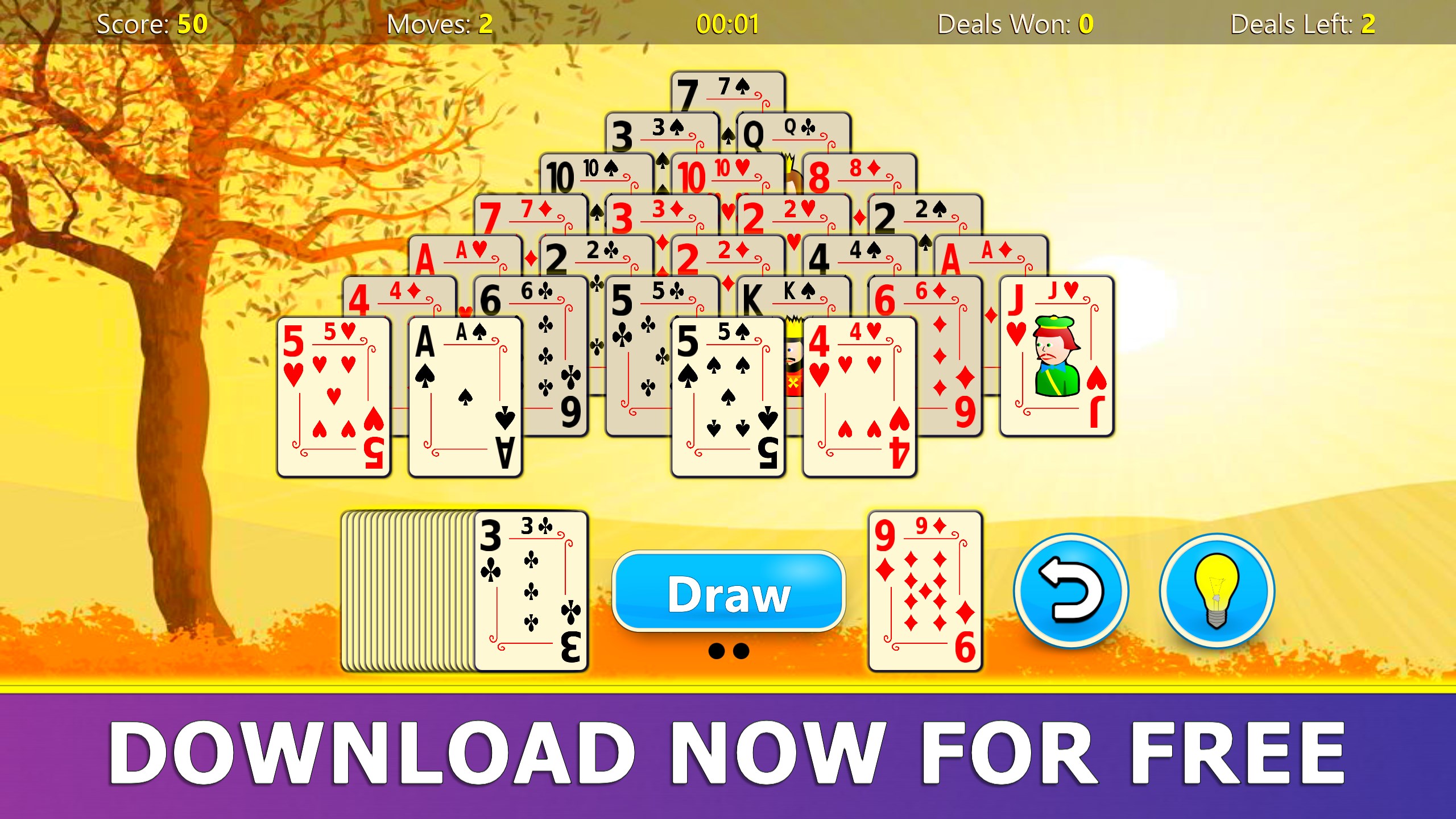 - You can only deal two times. If you eliminate a pyramid of cards, you complete one board and you receive an extra deal.