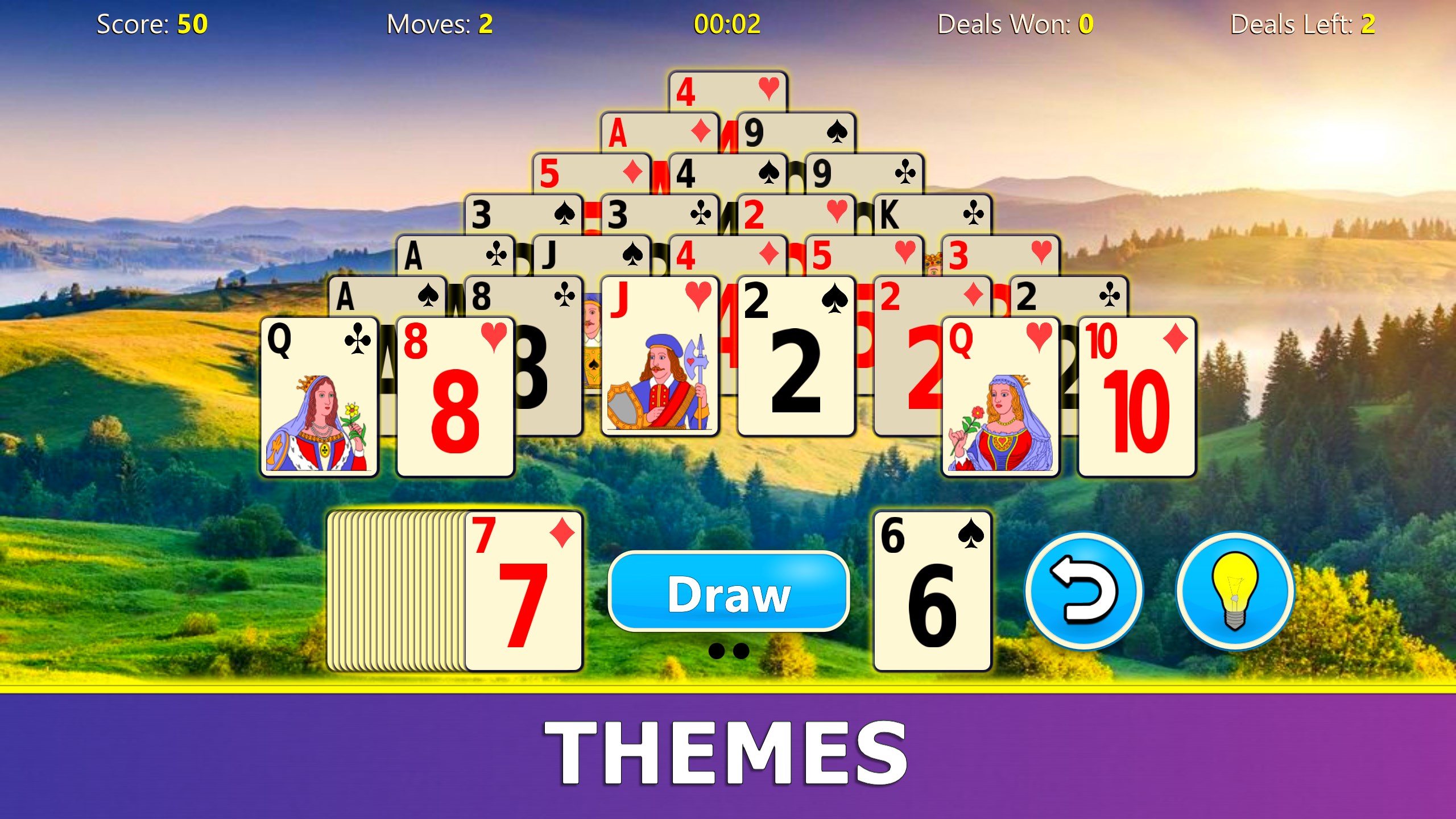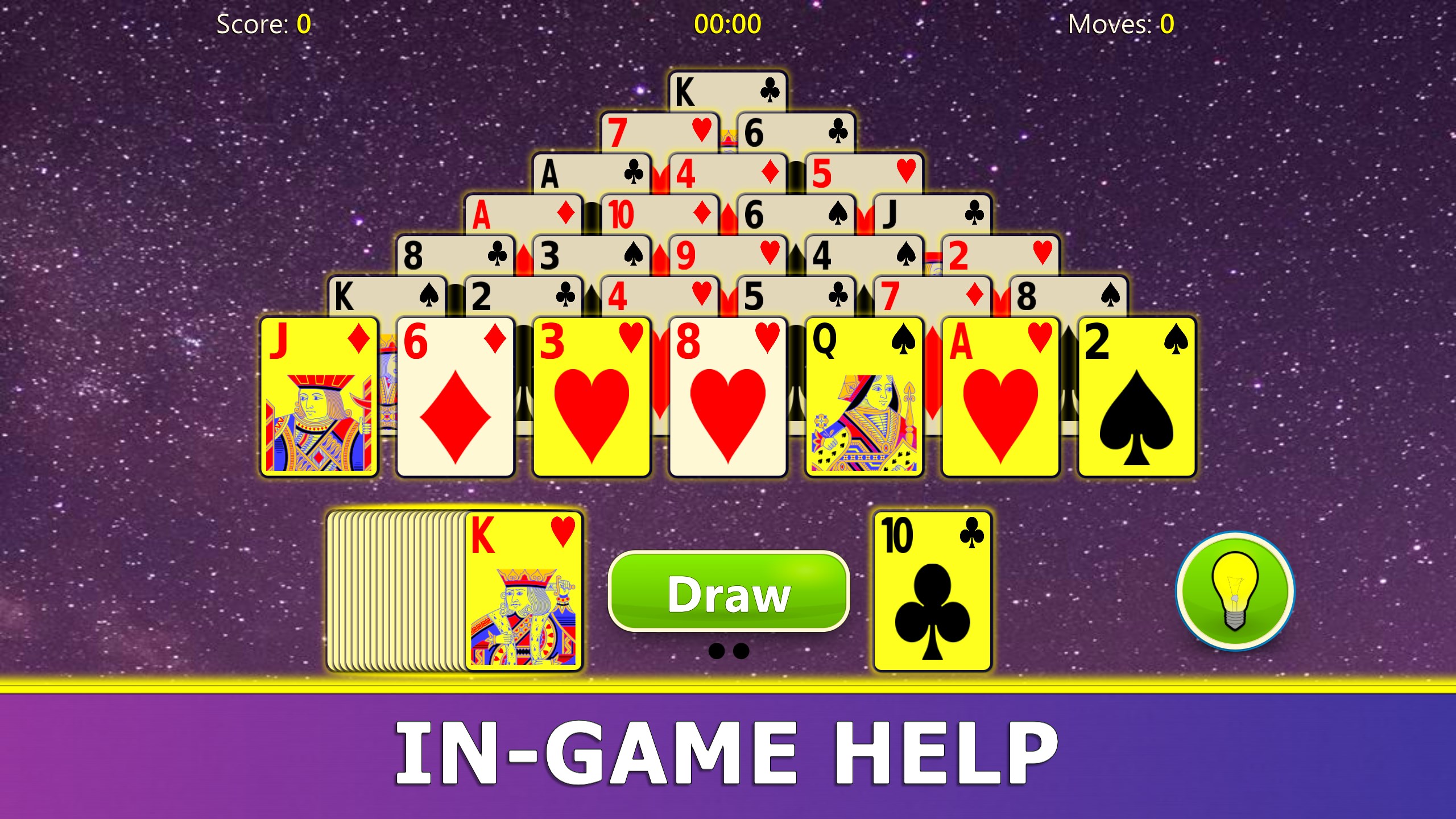 - On the board you will find a pyramid of cards and a stack from which you draw cards. If there are no available matches you can continue to draw from the stack.