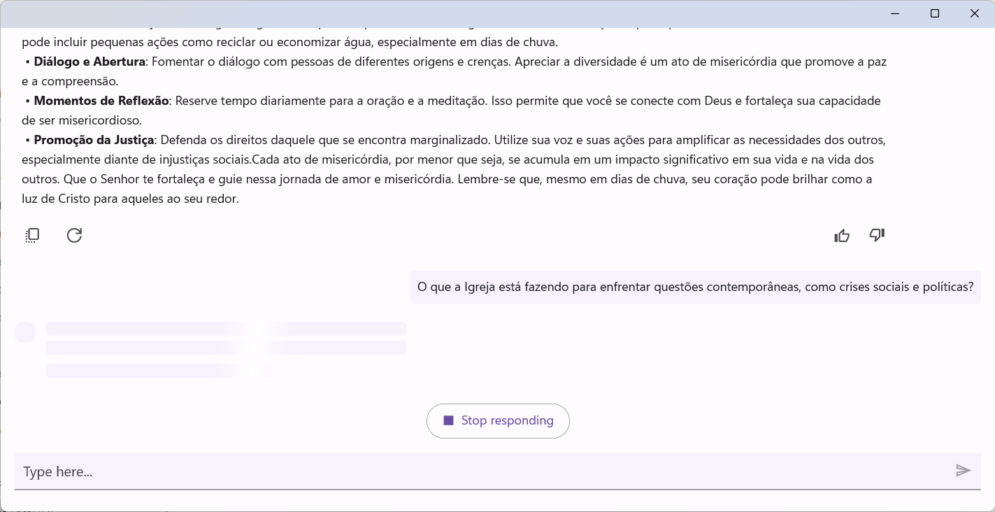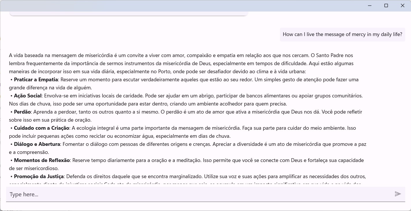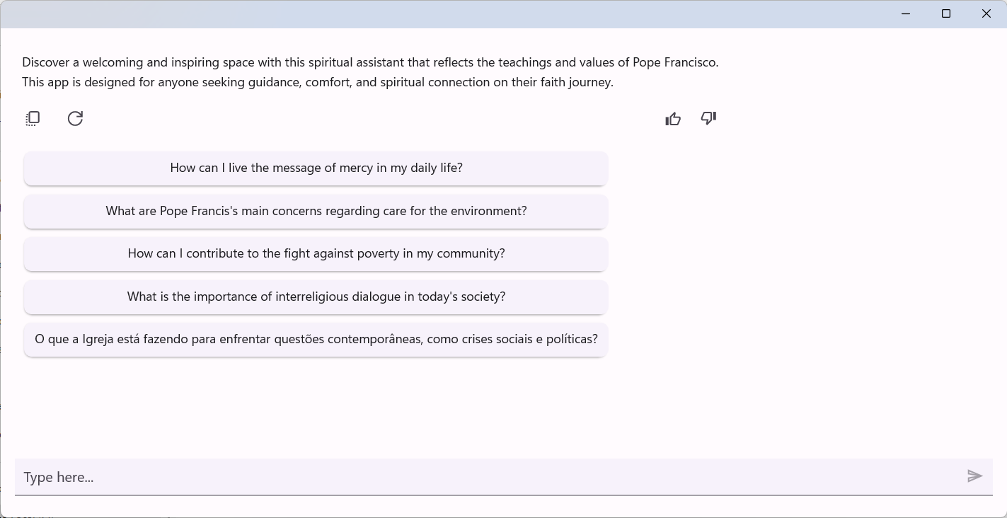 Personalized Guidance: Share your questions and concerns, and receive thoughtful, compassionate responses inspired by the homilies and teachings of Pope Francis. Spiritual Resources: Access prayers, daily Bible readings, and encyclicals to deepen your understanding and practice of the Christian faith. Daily Inspiration: Receive a thought-provoking quote or reflection each day to motivate and encourage you in facing life\'s challenges. Relevant Themes: Explore topics such as mercy, care for the environment, social justice, and the value of interreligious dialogue. Community and Support: Share your experiences and connect with other users to exchange ideas and strengthen your faith in a respectful and compassionate environment.