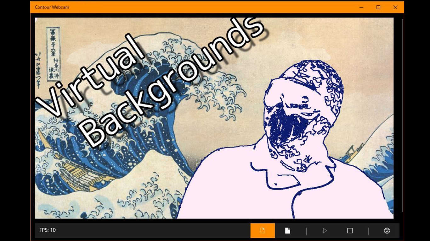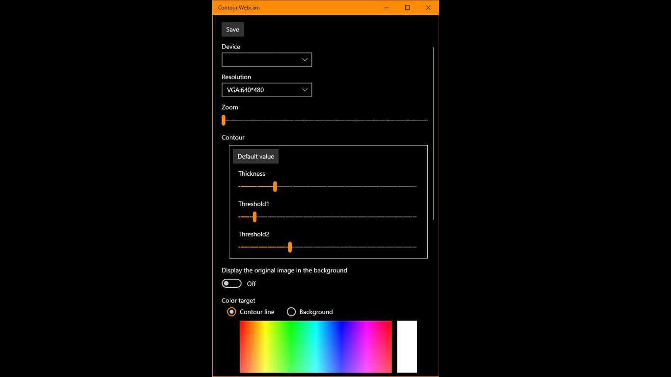Settings: Outline thickness and color, background color, chroma key (virtual background), brightness, contrast and posterization.Can display the original image in the background. At that time, you can blur the image. Can zoom the image .Supports Compact overlay mode.In addition to any webcam as a device, you can also specify a capture board.