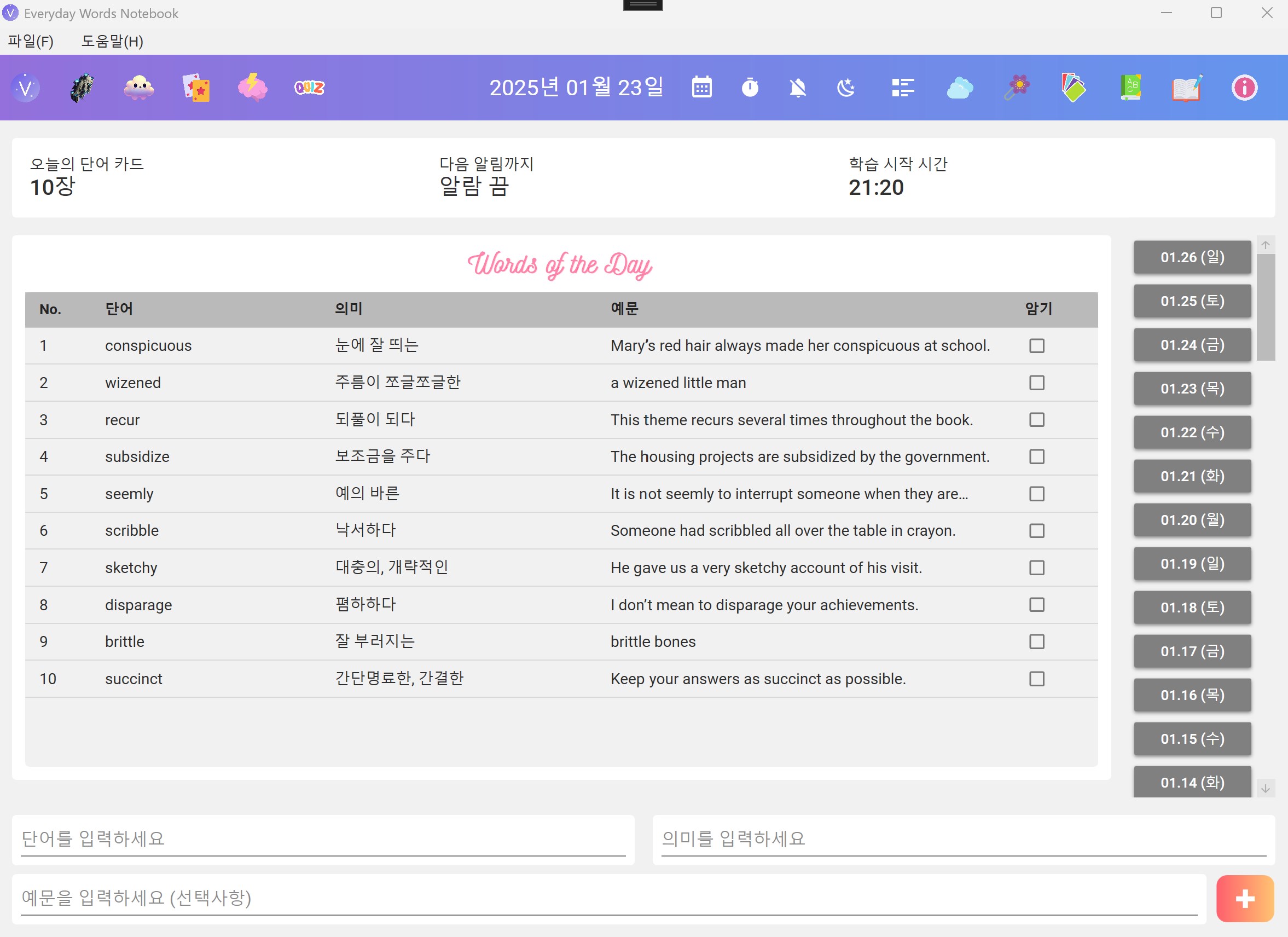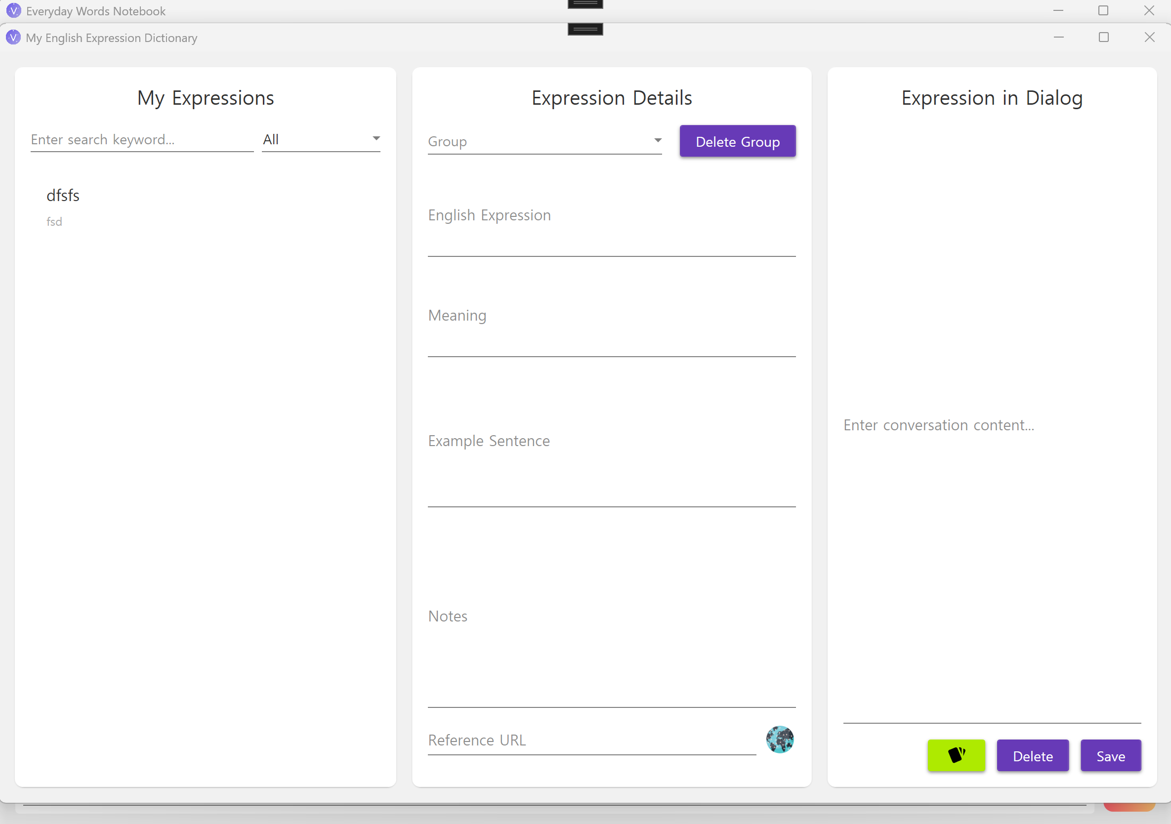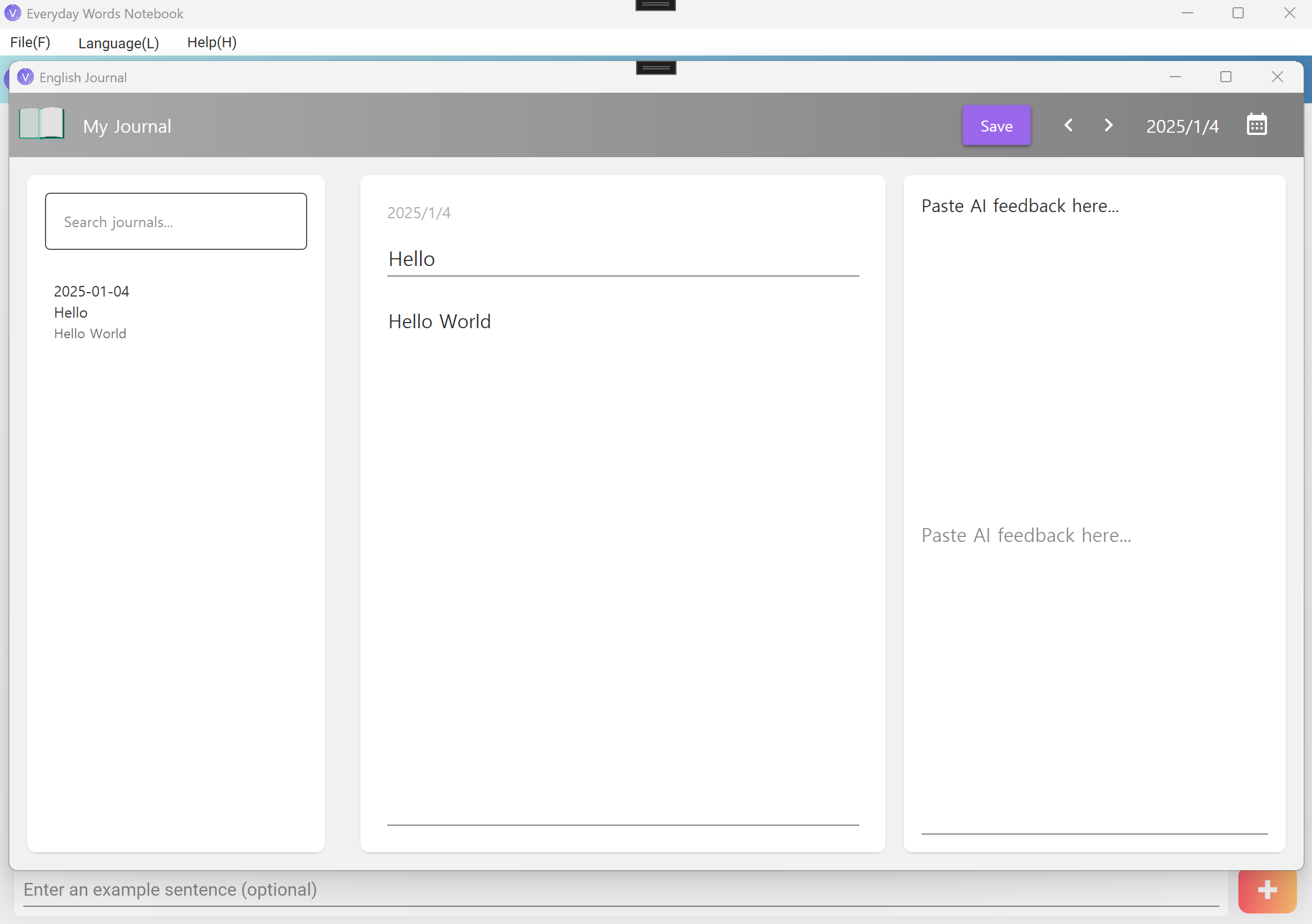 - Vocabulary Management – Store words, meanings, and example sentences, with English dictionary definitions provided.