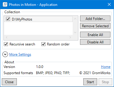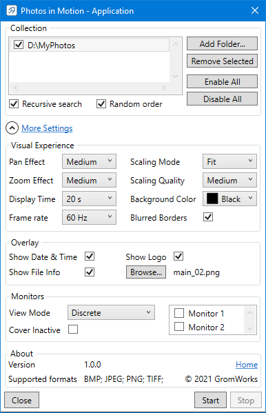 Photos in Motion is a nice slideshow app with Pan and Zoom effects and multiple monitors support. Highly configurable but still easy to use. Can be set as a Windows screen saver. Custom logo can be shown as an overlay.