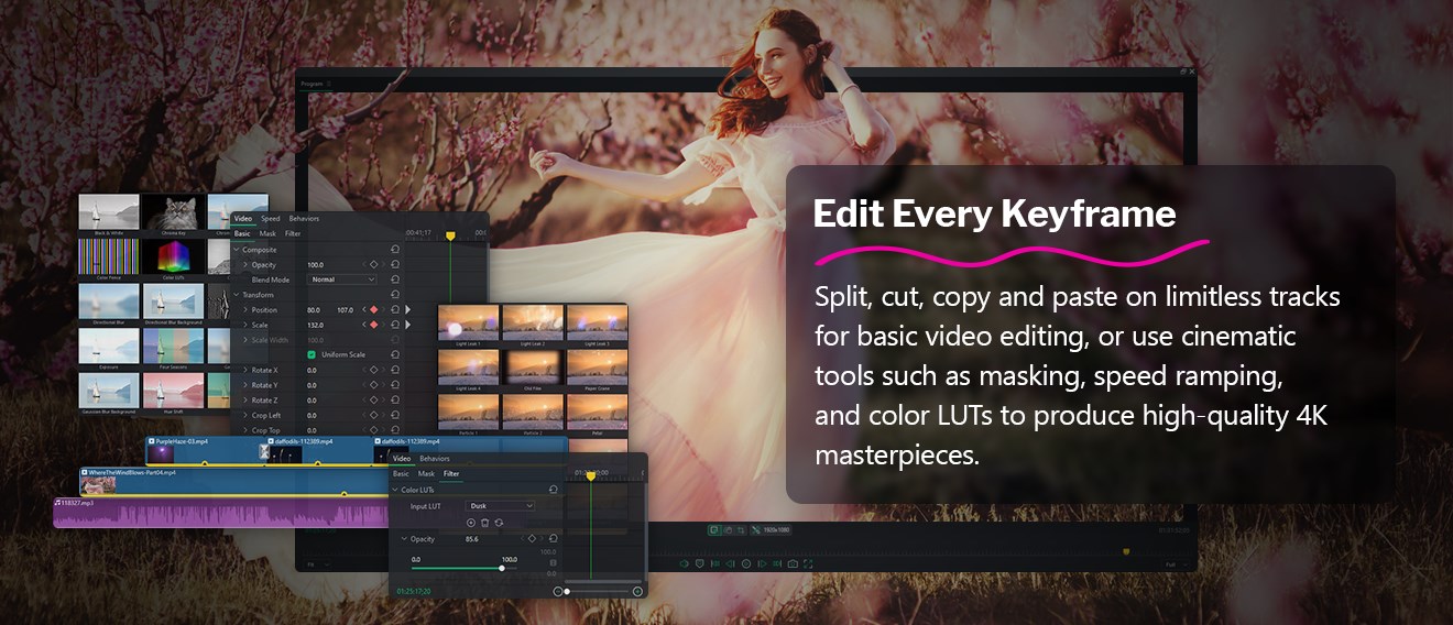Do it all with LUXEA Pro Video Editor’s advanced video editing tools. Split, cut, copy and paste for basic video editing, or use cinematic tools such as masking, speed ramping, and color LUTs to produce high-quality 4K masterpieces. Fine-tune audio and video effects with keyframes, edit media files before and after adding them to the timeline, and customize your workspace.