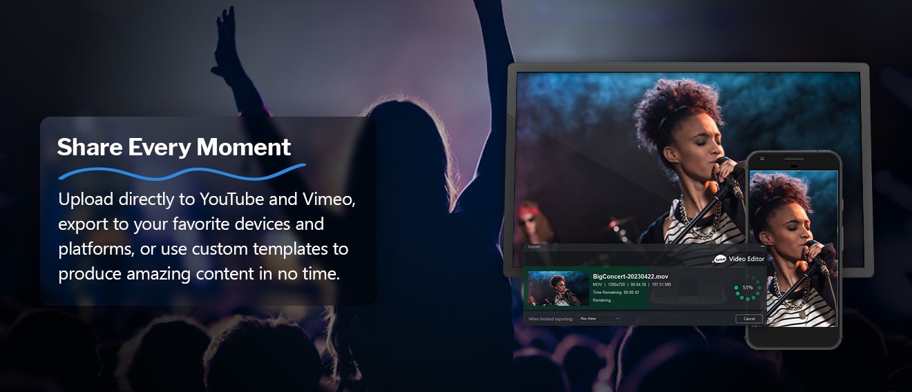 Produce amazing content in no time by uploading directly to YouTube and Vimeo. LUXEA Pro Video Editor makes it easy to export your creations to your favorite devices and platforms. The export preview allows you to watch your rendering progress in real-time and receive a sound reminder once it’s finished. And for even more convenience, save time by creating and reusing your own customized templates, so you can focus on what matters most – making great videos!