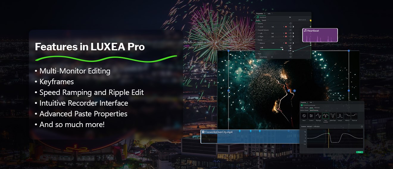 Limitless Tracks: Layer audio, video, and images on as many tracks as you want. Tweak background color and media transparency to create a layered hierarchy.Tailored Social Media Outputs: Easily create perfect posts using preset settings optimized for Youtube and Vimeo, all from within the Export Tool.Produce in 4K: Support for 4K lets you produce full-quality cinematic masterpieces.Multi-monitor Editing: Experience a smooth workflow across multiple displays, allowing you to view your project in Fullscreen while having your tools conveniently close-by on another monitor.Home Screen: The sleek Home Screen lets you start a new recording, dive into a new project, or open a recent project to pick up where you left off.Customizable Workspace: Pop out, Snap in, and rearrange any panel to your creative desire. Make your work flow for you with the Customizable Workspace.Keyboard Shortcuts: Use default keyboard shortcuts or create your own and modify them to your liking using the Keyboard Shortcuts Manager.Pre-edit Source Files: View and edit files right from the source, before even placing them on the Timeline.Search Your Media: Search media by file name using the Media panel search bar.Relink Media: Relink Media assets that have been moved to a new location on your computer without needing to import them again.Shared Media: Increase your efficiency by adding frequently used media files to the Shared media folder so you can access those files anytime without importing.Video File Support: Add AVI, MP4, WMV, FLV, MOV, TS, MTS, M2TS, ASF, M4V, MPG, and MPEG files to your project and create your video.Screen Recording: Record your screen at up to 120 fps, with or without audio and voice recording. Pause and resume as needed and customize your recording hotkeys for quick and effortless moviemaking.Pack Manager: Install and manage Content Packs for LUXEA Pro Video Editor within the app.Auto Stop Record: Automatically end recordings based on recording time or file size and allow the computer to sleep or shut down upon completing the recording.Keyframes: Apply Keyframes to your media for precise control over properties. You can also use Keyframes to control audio levels, channel volume, balance, pitch, and more.Masking: Choose from a variety of mask shapes to hide parts of your media. Feather the mask edges to soften them - perfect for a double exposure effect.Speed Ramping: Ease the transition between slow motion and high-speed footage using Speed Ramping.Reverse Speed: Play media clips forwards and backwards to create surreal video sequences.Green Screen/Chroma Key Support: Put your subject anywhere. Remove green screen, or the color of your choosing, and layer in other videos or still images to create your own background.