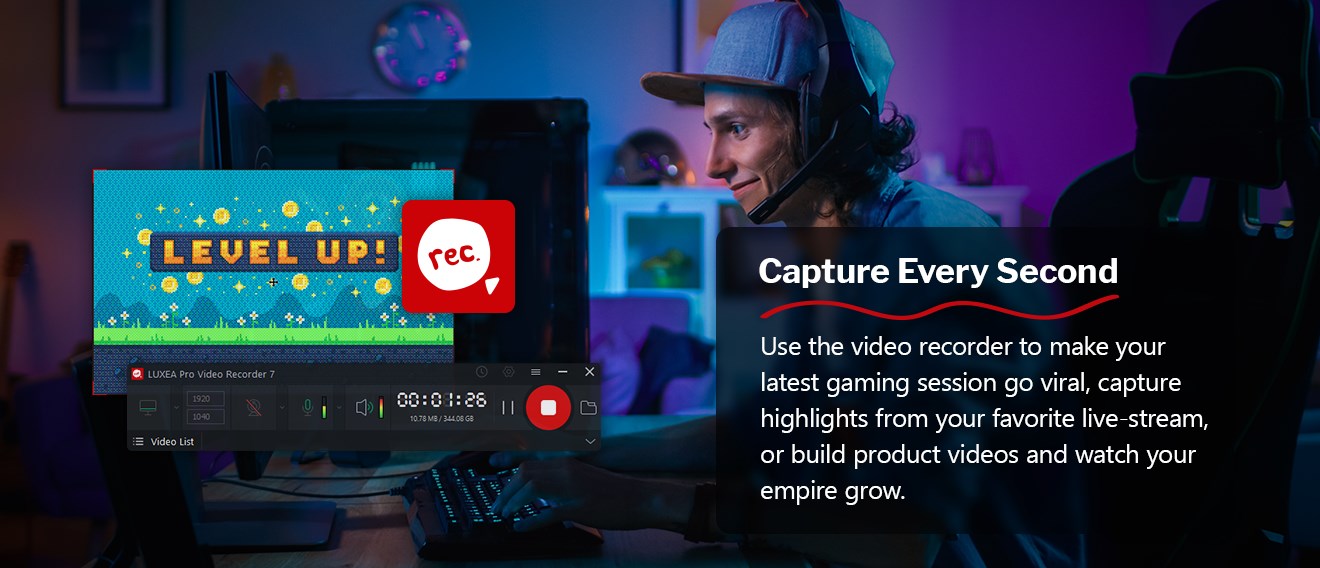 LUXEA Pro Video Editor includes a video recorder to easily create high-quality, real-time MP4s with zero rendering time. Make your latest gaming session go viral, capture highlights from your favorite live-stream, or build product videos and watch your empire grow. It’s as easy as clicking a big red button. Use your webcam, screen, microphone, system audio, or any combination. You can customize the recording options to fit your project’s workflow – such as setting the recording quality, duration, and applying visual and audio effects – while pushing the limits of creative vision with a screen recording frame rate of up to 120 frames per second and no cap on your recording time.