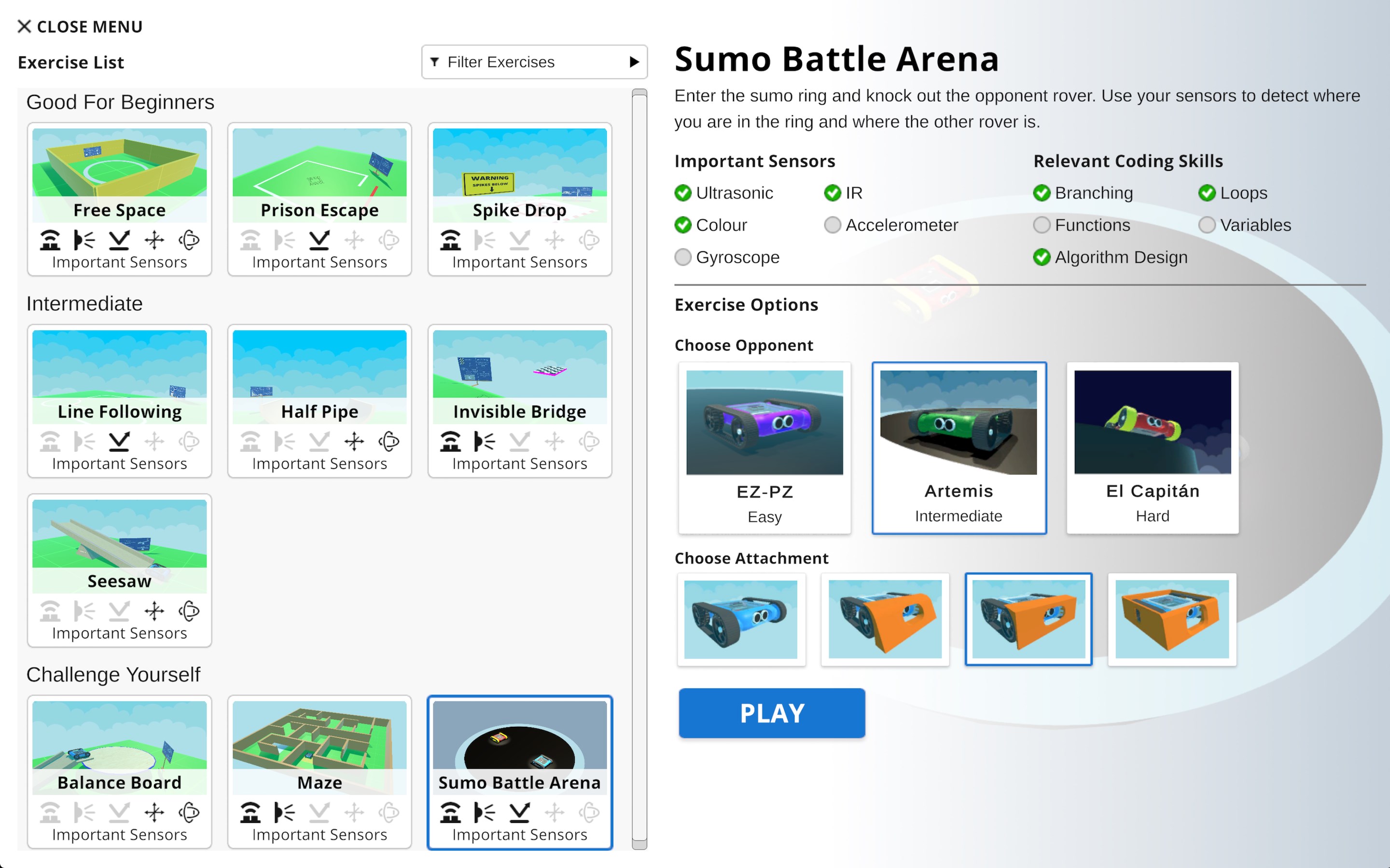 Many new environments including a robot sumo competition ring with computer opponents and rover attachments.