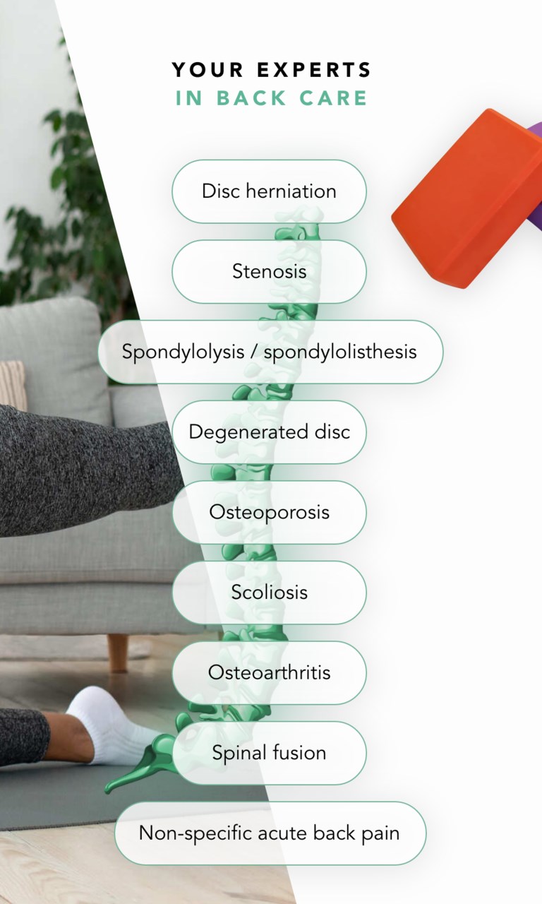 There are different exercise recommendations to target these neck and back pain conditions: Disc Protrusion, Degenerated Disc, Scoliosis, Spinal Fusion, Stenosis, Spondylolisthesis, Osteoporosis, Osteoarthritis and Non-Specific Acute Back Pain. With the ELDOA method, you can even target specific areas of your spine, such as vertebrae L5-S1.