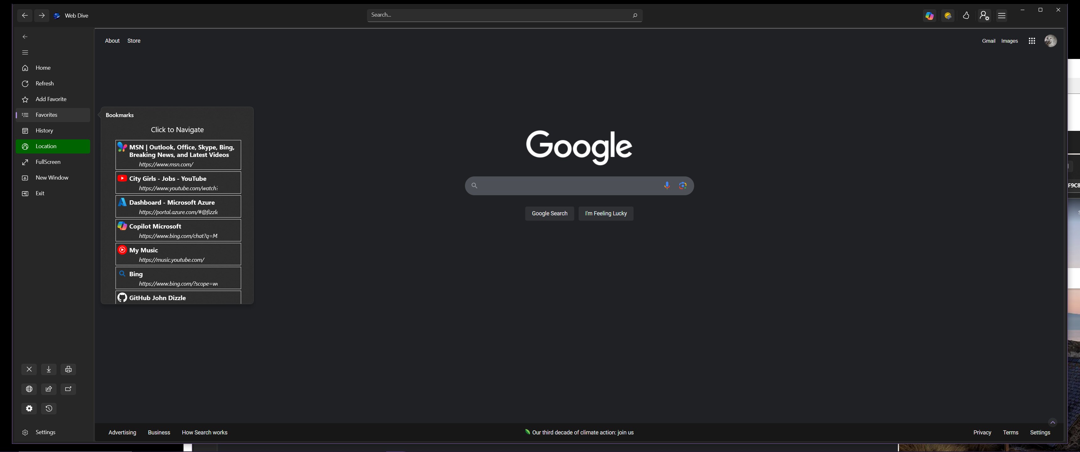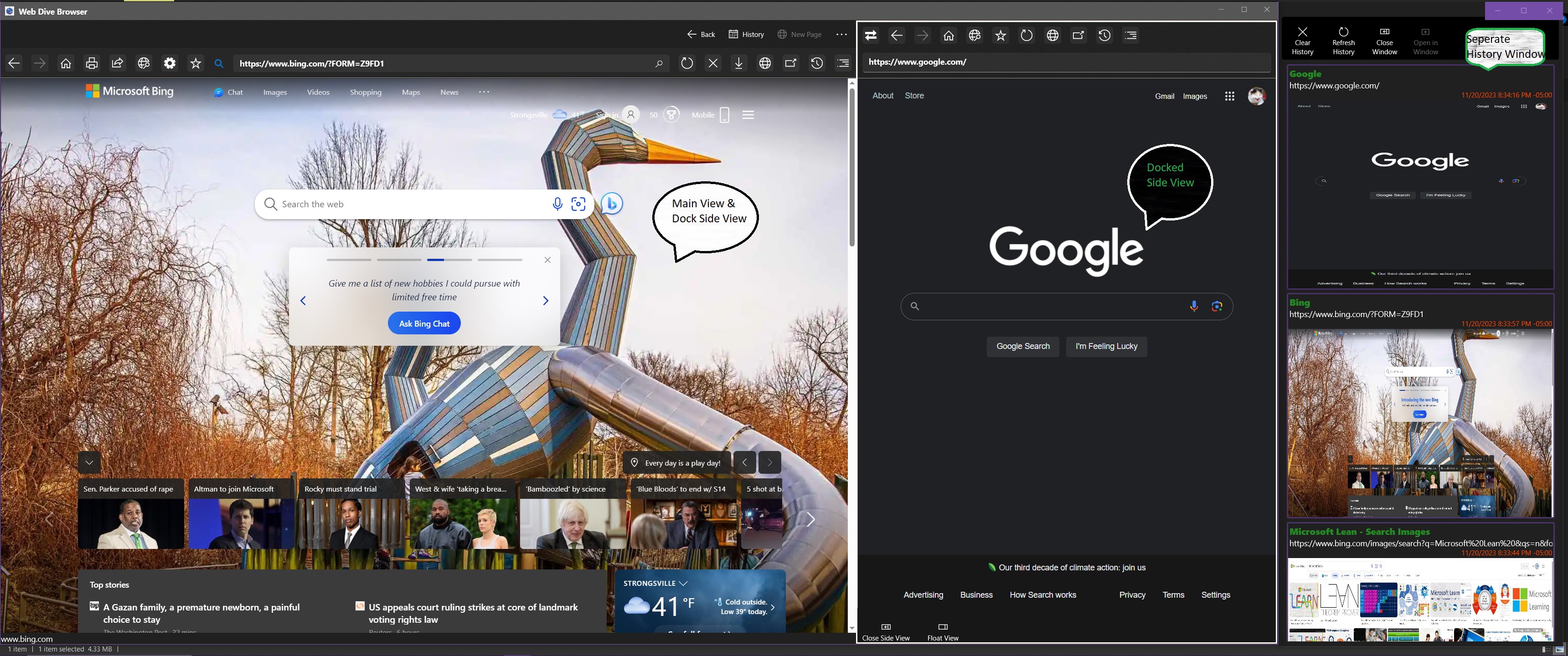 Web Dive is a single page web browser utilizing Chrome's Chromium Engine that offers single page navigation with a side view for popups and new tab generation.