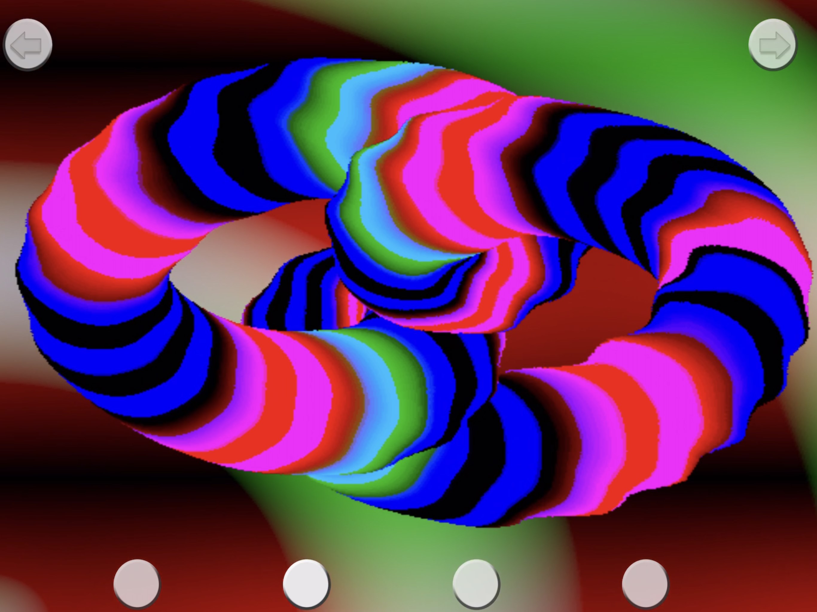 The concept for this app is to create a calm, visual, original and engaging experience, with slow intriguing developing moving multi-color knots. There is a compelling combination of layouts, shapes and colors to enjoy, and a range of styles pressing the left/right arrows.