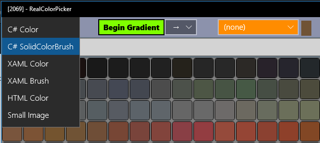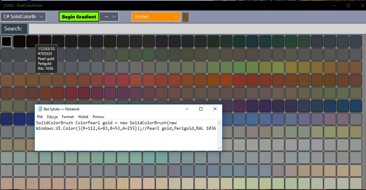 You can choose from over 2000 existing colors, and get in the Clipboard ready piece of code in c #: C# definition, SolidColorBrush, definition in XAML, XAML Brush, definition in HTML; or a small picture.