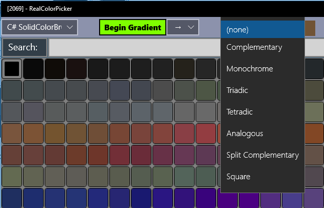Also: gradients, and transformations: Complementary, Triadic, Tetradic, Monochrome, Analogous, SplitComplementary and Square