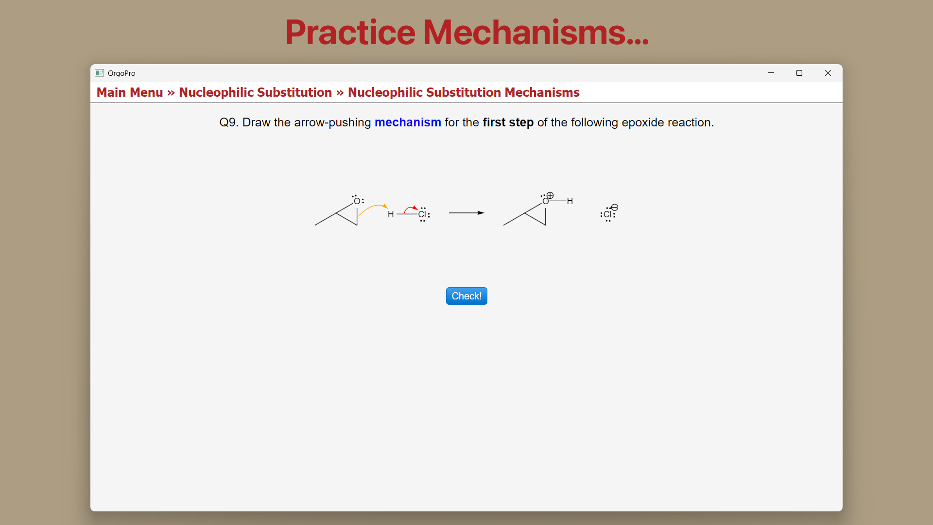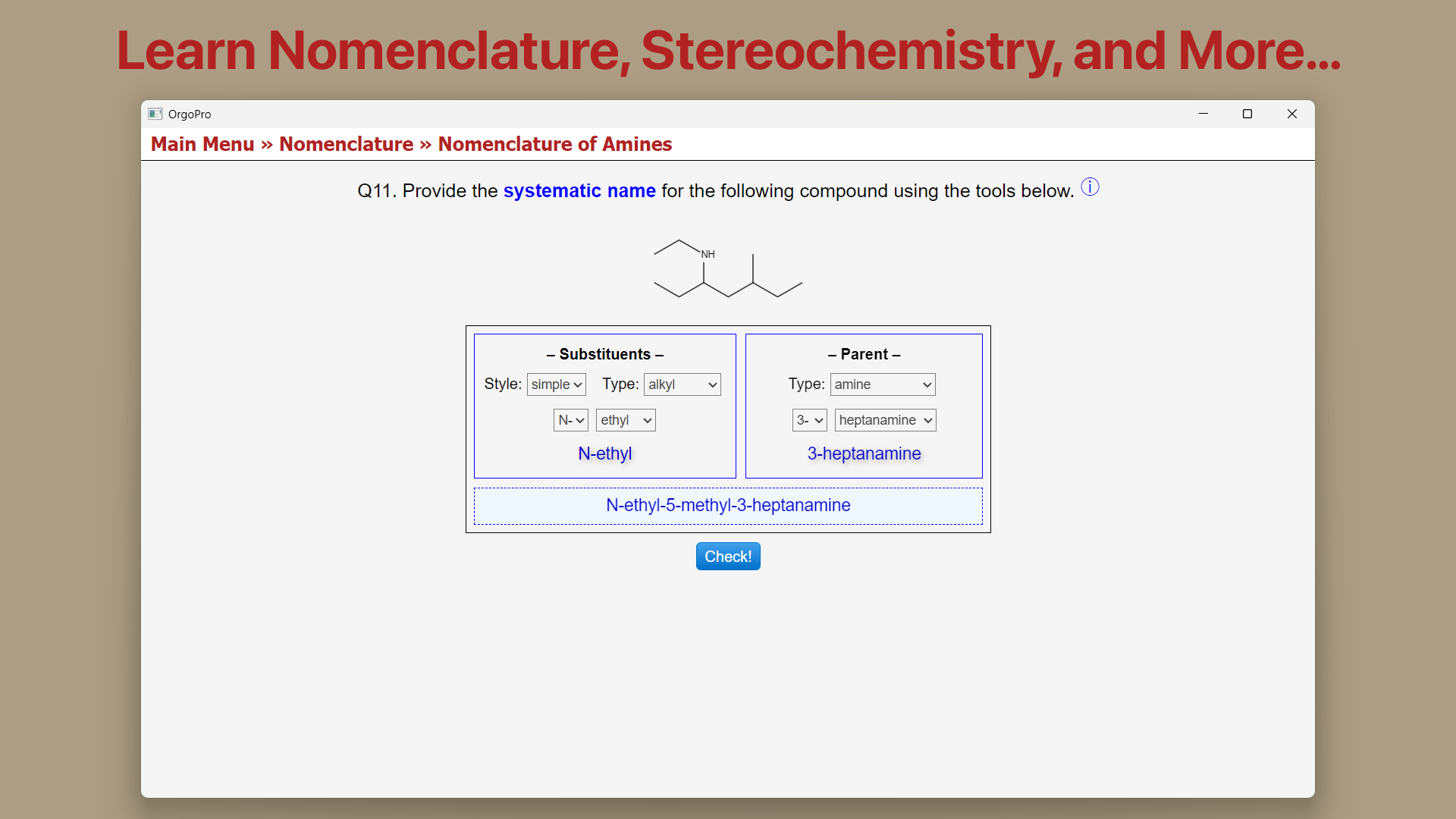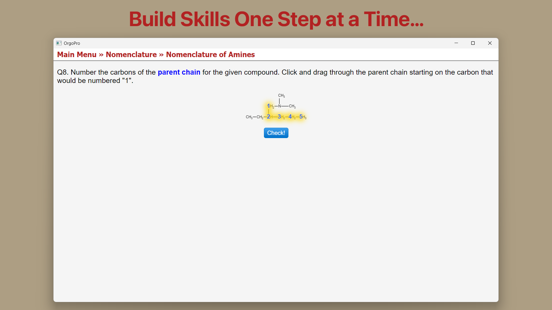 OrgoPro excels at teaching the many multistep processes encountered in organic chemistry. Tasks like systematic nomenclature and R/S configurational assignments of chiral centers are each broken down into smaller concepts for you to master.