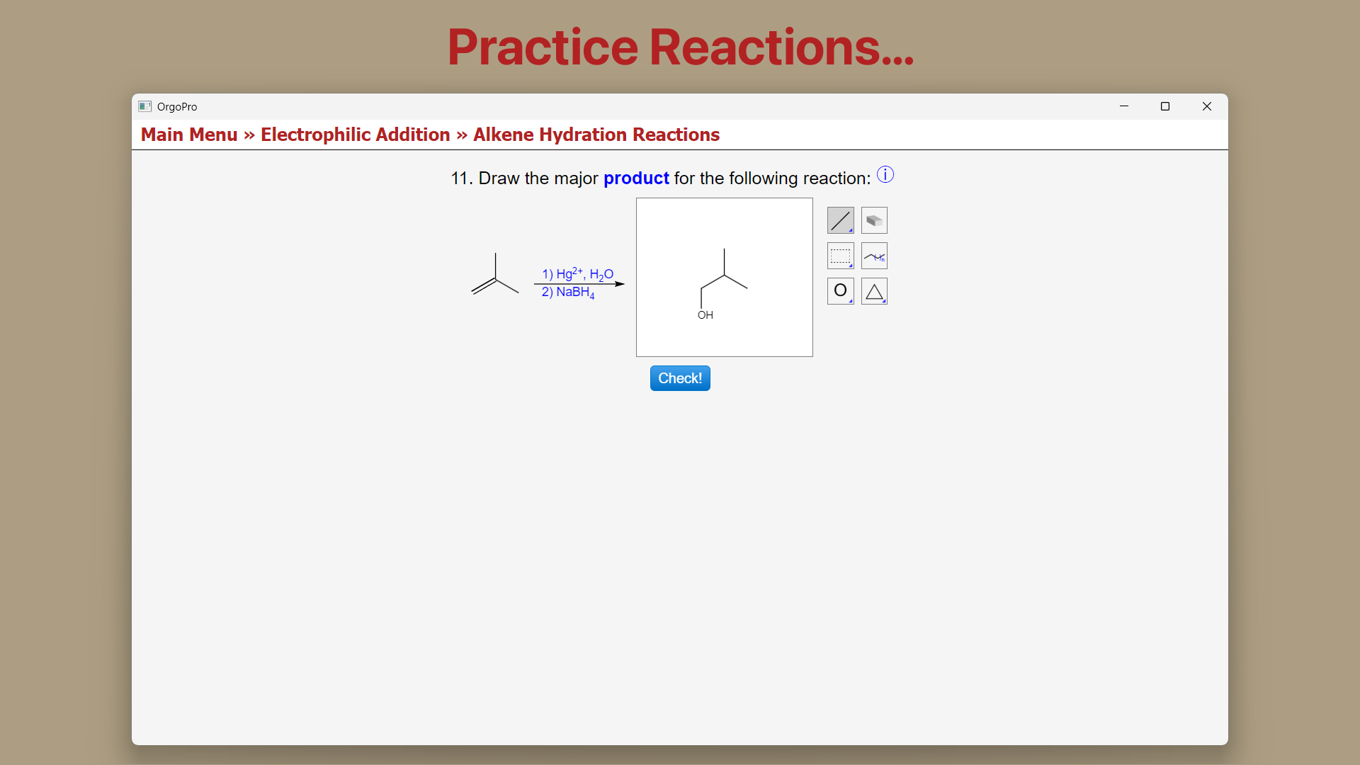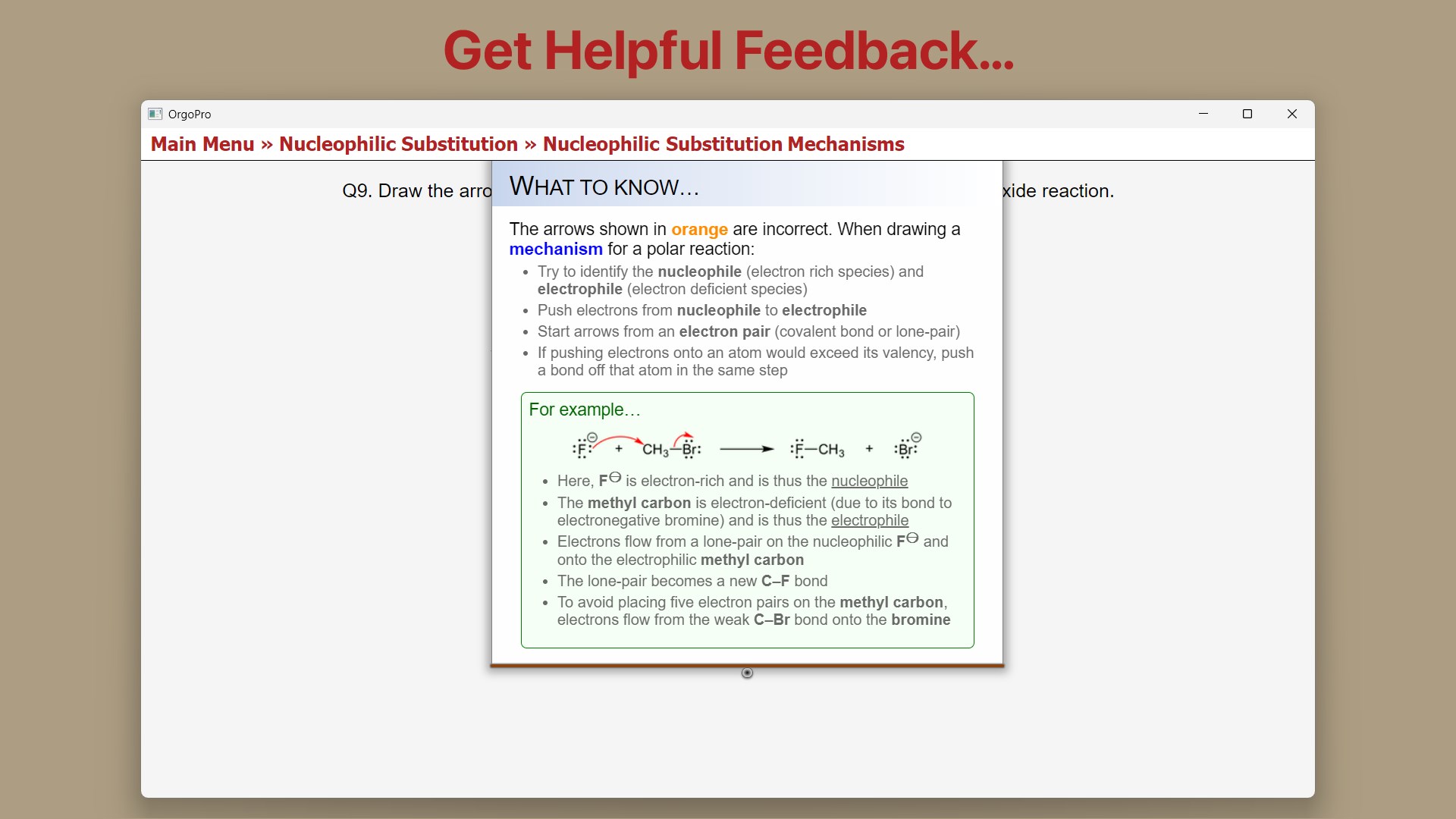 OrgoPro makes learning organic chemistry easier. Key concepts are broken down into smaller “Skills” that you practice, building knowledge and confidence as you progress. OrgoPro includes over 150 Skills for you to develop, enabling you to learn at your own pace. When you get a question wrong, helpful and descriptive feedback is provided that explains the relevant content. Feedback typically includes a detailed example that explains how to approach a similar problem. Apply what you learn from the feedback to correct your answer before tackling the next question.