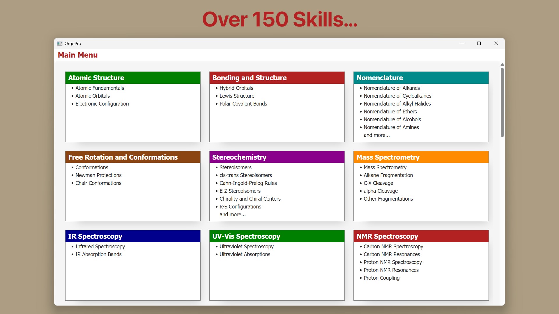 151 Skills including Nomenclature, Free Rotation (Newman Projections and Chair Conformations), Stereochemistry, MS, IR, UV, NMR, Acid-Base Chemistry, Resonance, Aromaticity, Reactions, and MechanismsOver 1,400 questionsHelpful, descriptive feedback that explains the relevant concepts for each questionDetailed examples within the feedback that explain how to approach similar problems