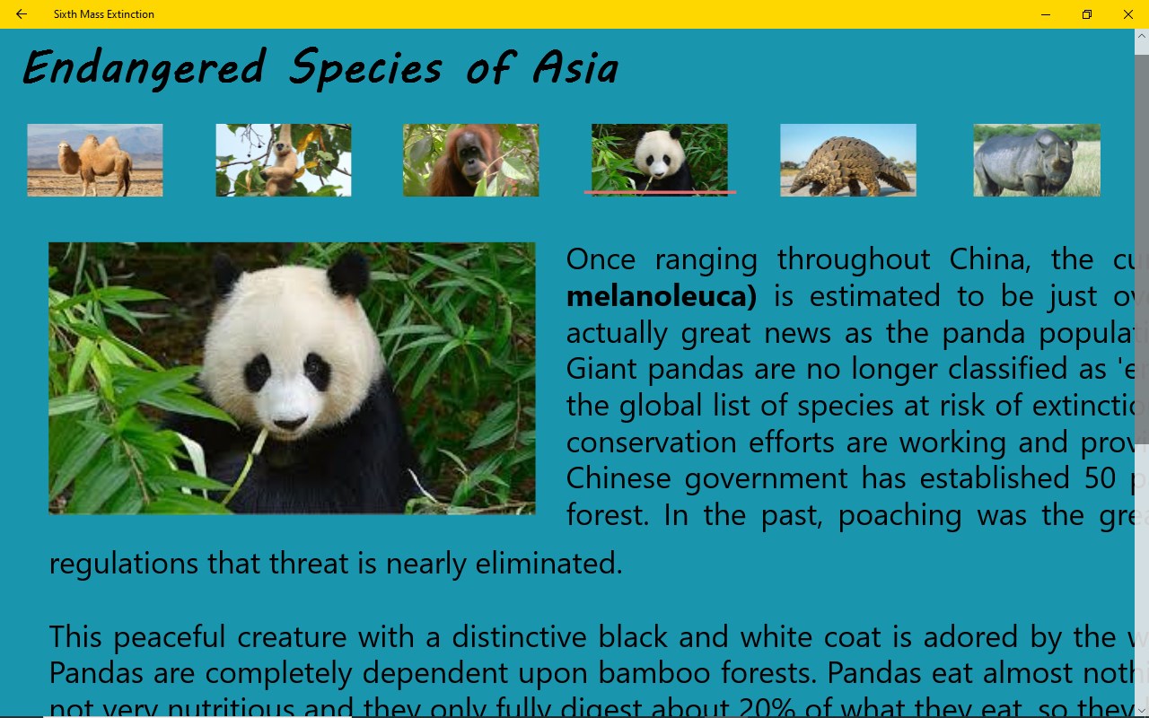 While it is impossible to cover everything, Sixth Mass Extinction focuses on the top ten endangered species on each continent. Examining the plight of each species, threats to their survival and suggestions for how you can help. Tons of pictures, easy learning and fun games makes this the perfect tool for everyone who wants to start protecting our planet.