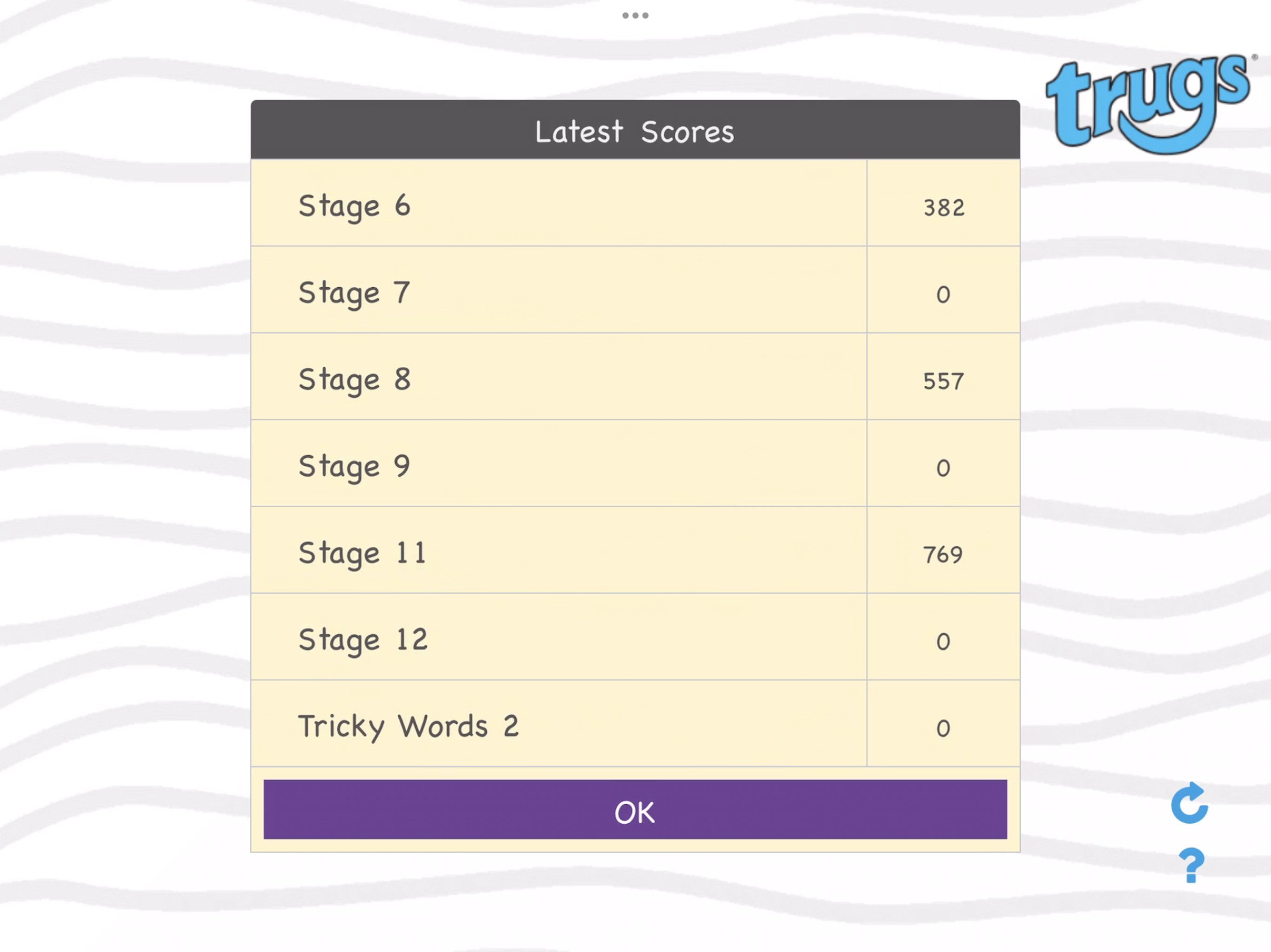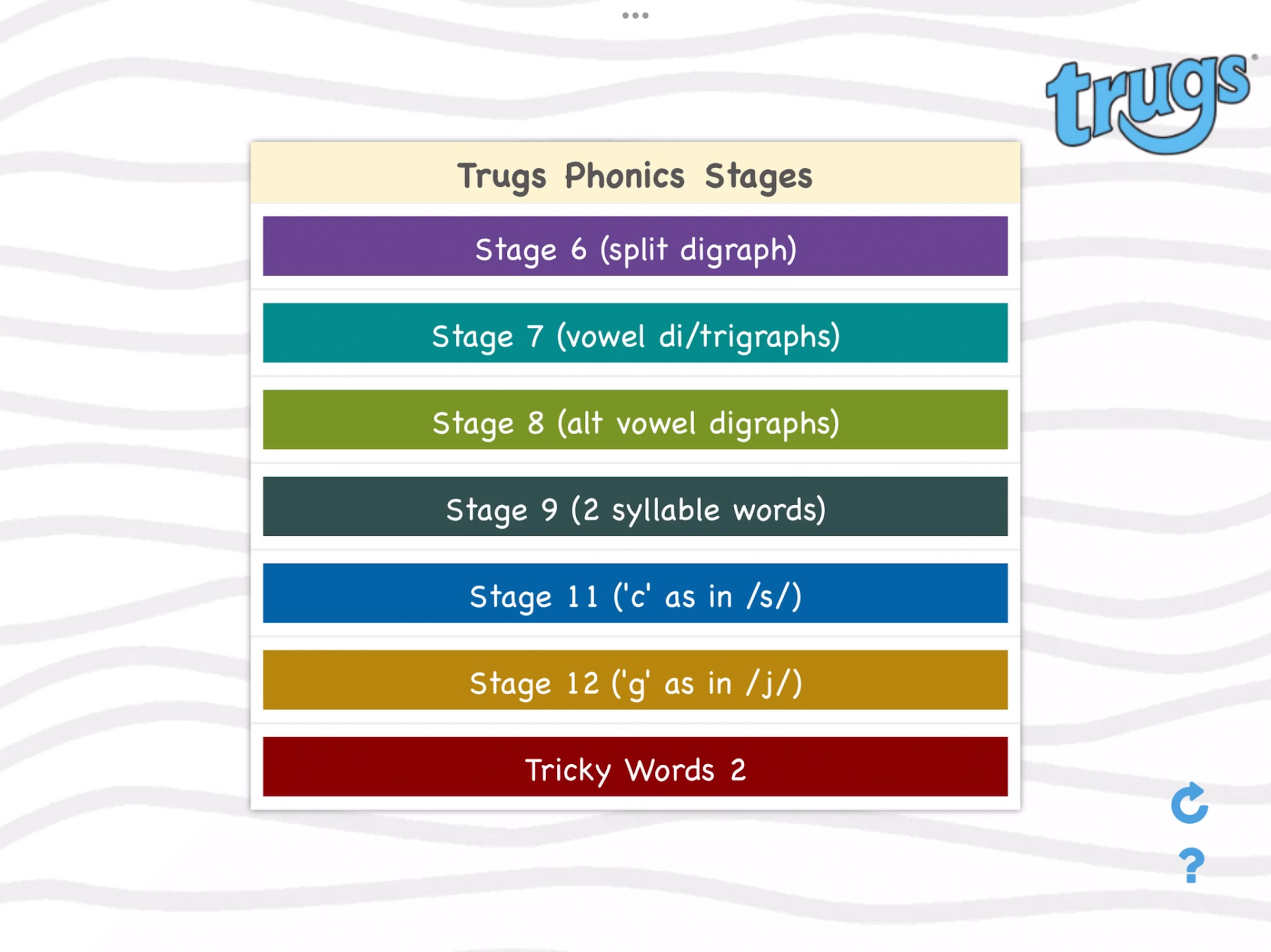 Trugs Word Search App 2 covers Trugs Stages 6,7,8,9,11,12 and Tricky Words 2, listed below in the chart. Word Search 2 contains mid sized length words, typically 6 to 10 letter. Trugs Word Search 1 and 3 are available for early learners and more advanced readers.