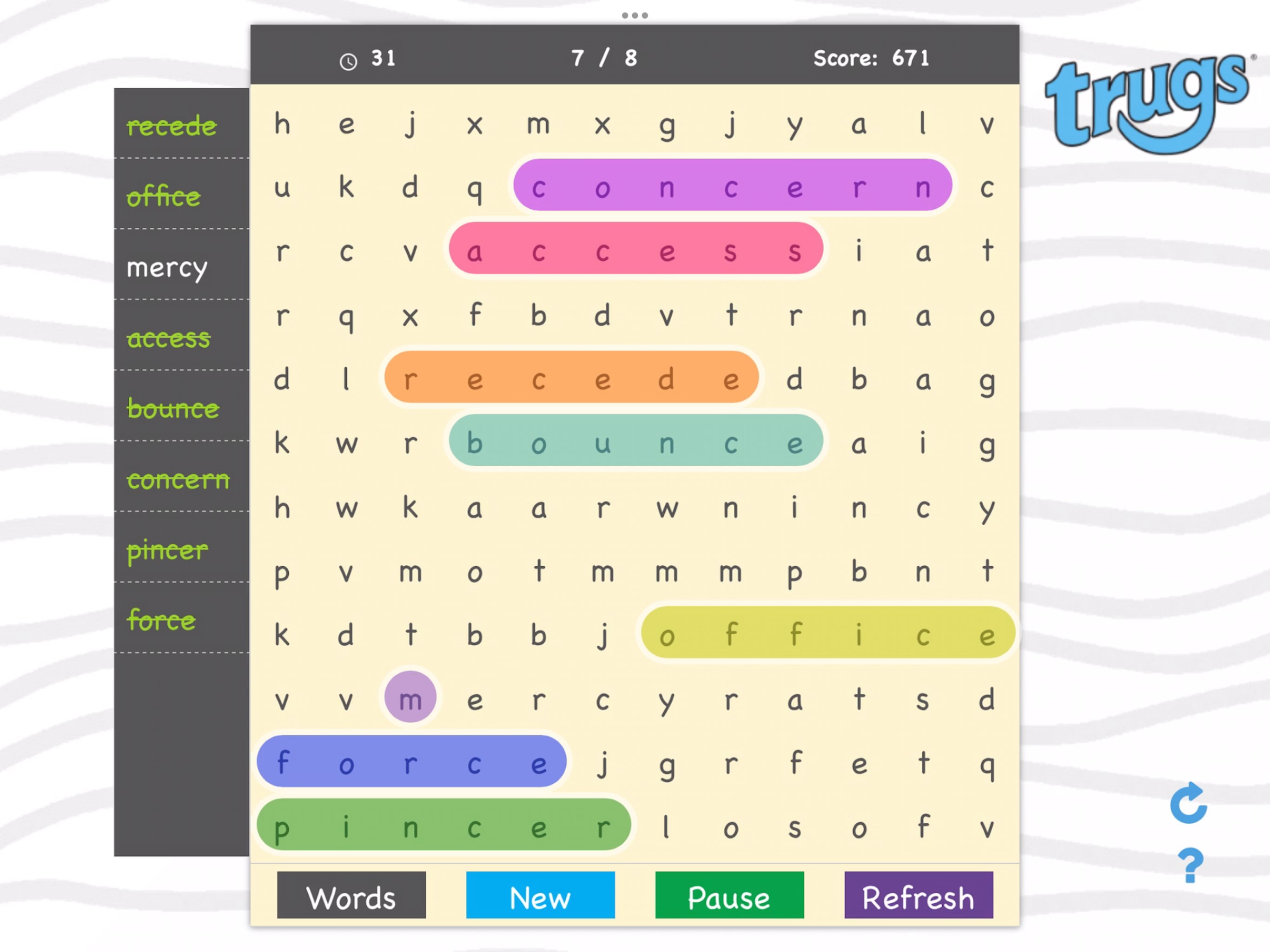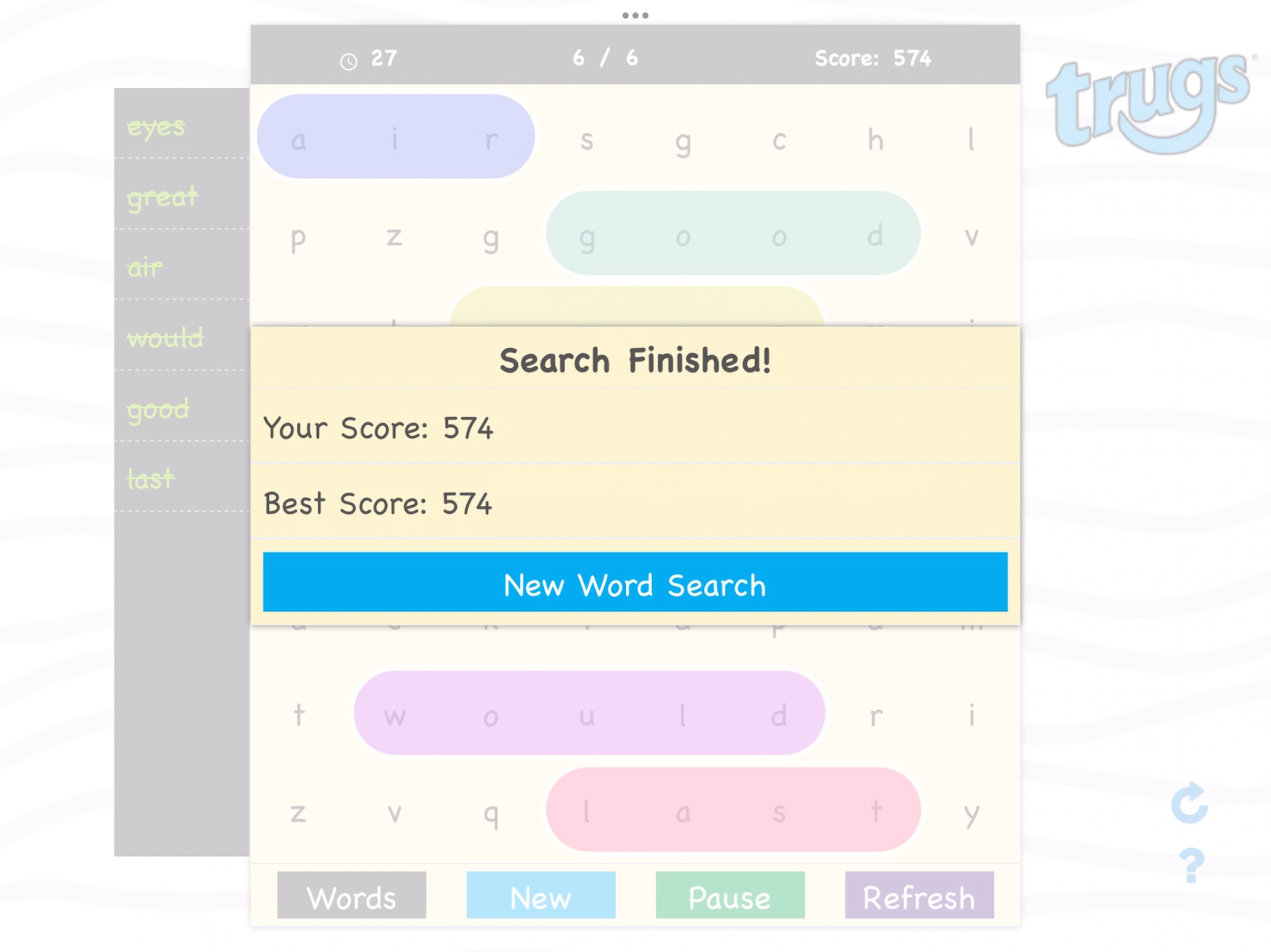 4. The word list can be refreshed or replaced any time by tapping the "Refresh" button. The search can be Paused, and a New search can be started at anytime