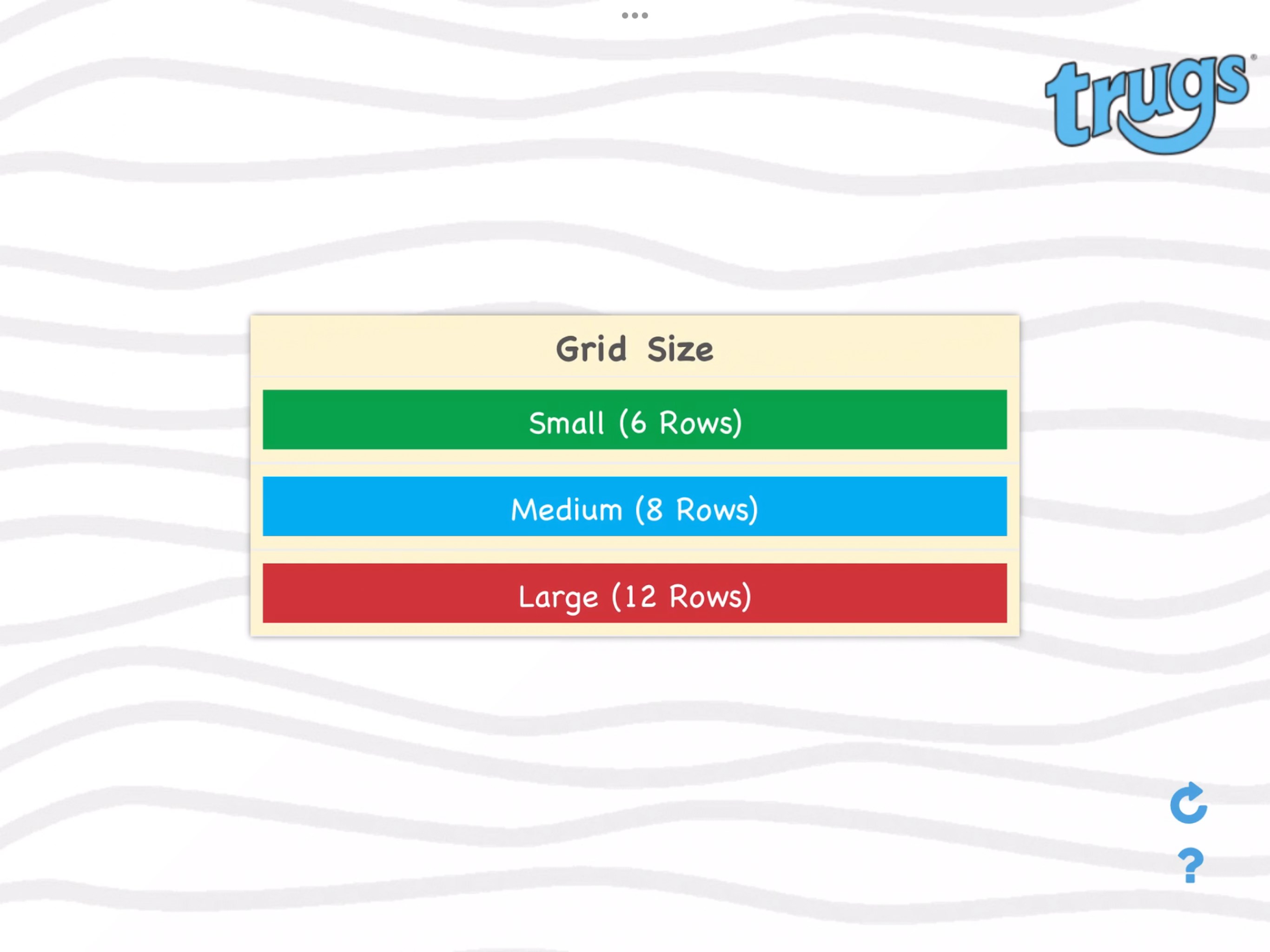 1. Choose the wordsearch grid size, Small 6x6 letters, Medium 8x8 letters or Large 12x12 letters. The Large grid is ideally suited to an iPad screen size.