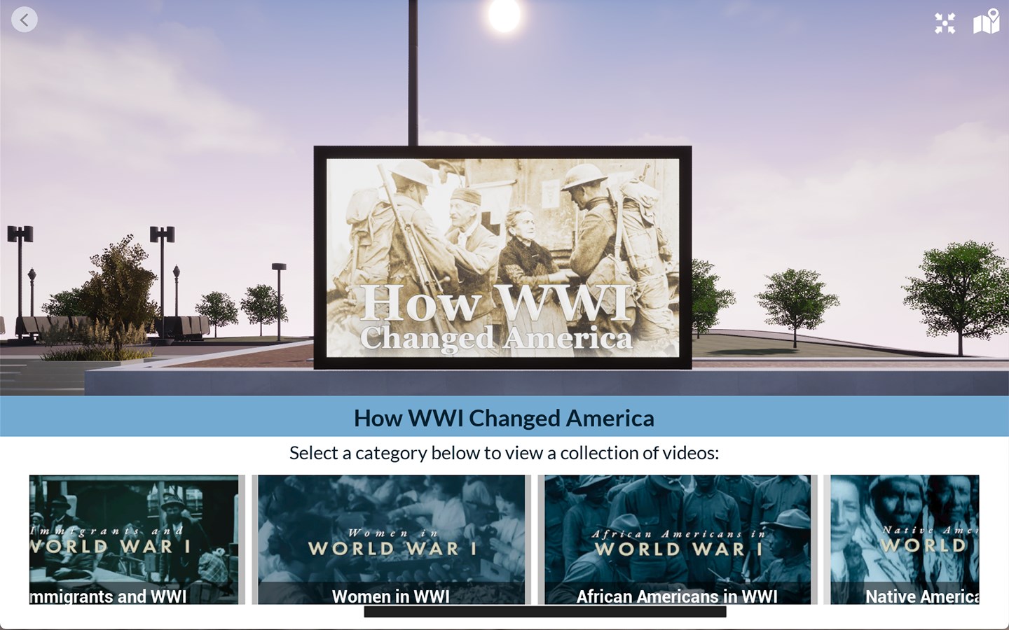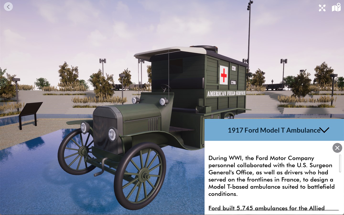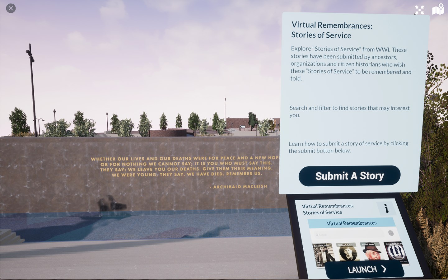 Interactive Virtual Tour: Navigate the 1.7-acre park and explore narrated, interactive audio-visual experiences located throughout the virtual memorial.The Sinking of the Lusitania: Engage with a 3D story where you control the camera, bringing this pivotal event to life.The Vehicles of WWI: Examine detailed models of WWI airplanes, ambulances, tanks, and even a 1917 vintage Harley Davidson.The Timeline Tower: Discover an 80-foot tall virtual timeline featuring 50 key WWI events, each narrated for an in-depth historical understanding of often surprising event relationship.A Soldier\’s Journey narrates the story of the 38-figure, 60-foot long centerpiece bronze sculpture that is completing the WWI Memorial in the fall of 2024.How WWI Changed America: a series of 50 micro documentaries with leading WWI historians that explore the social impacts of WWI on US society.Pershing Legacy of Service: tells the story of General John J. Pershing the commanding General of the Armies in WWI and his family legacy of service.The Genesis of the Modern Tank: How did it gets its name? What role did the tank play in WWI?The King of Battle: What was the most destructive weapon of WWI in an era when warfare became wholesale slaughter?Stories of service: Submit your family WWI Story of Service for others to hear. Comings soon the service records in this feature will grow from a mere 1,000 stories to several HUNDRED THOUSAND. AND MORE...