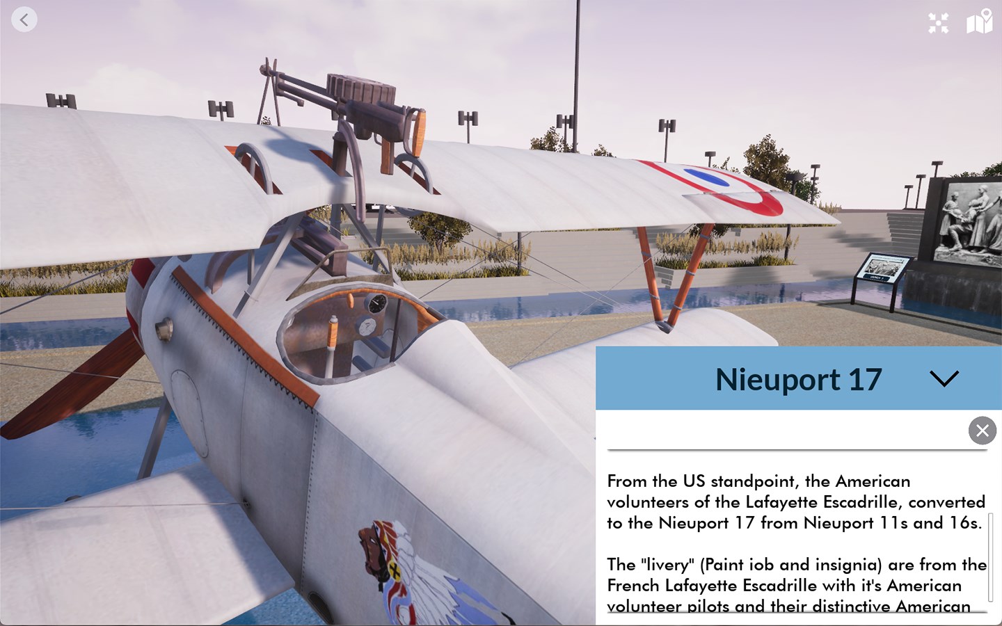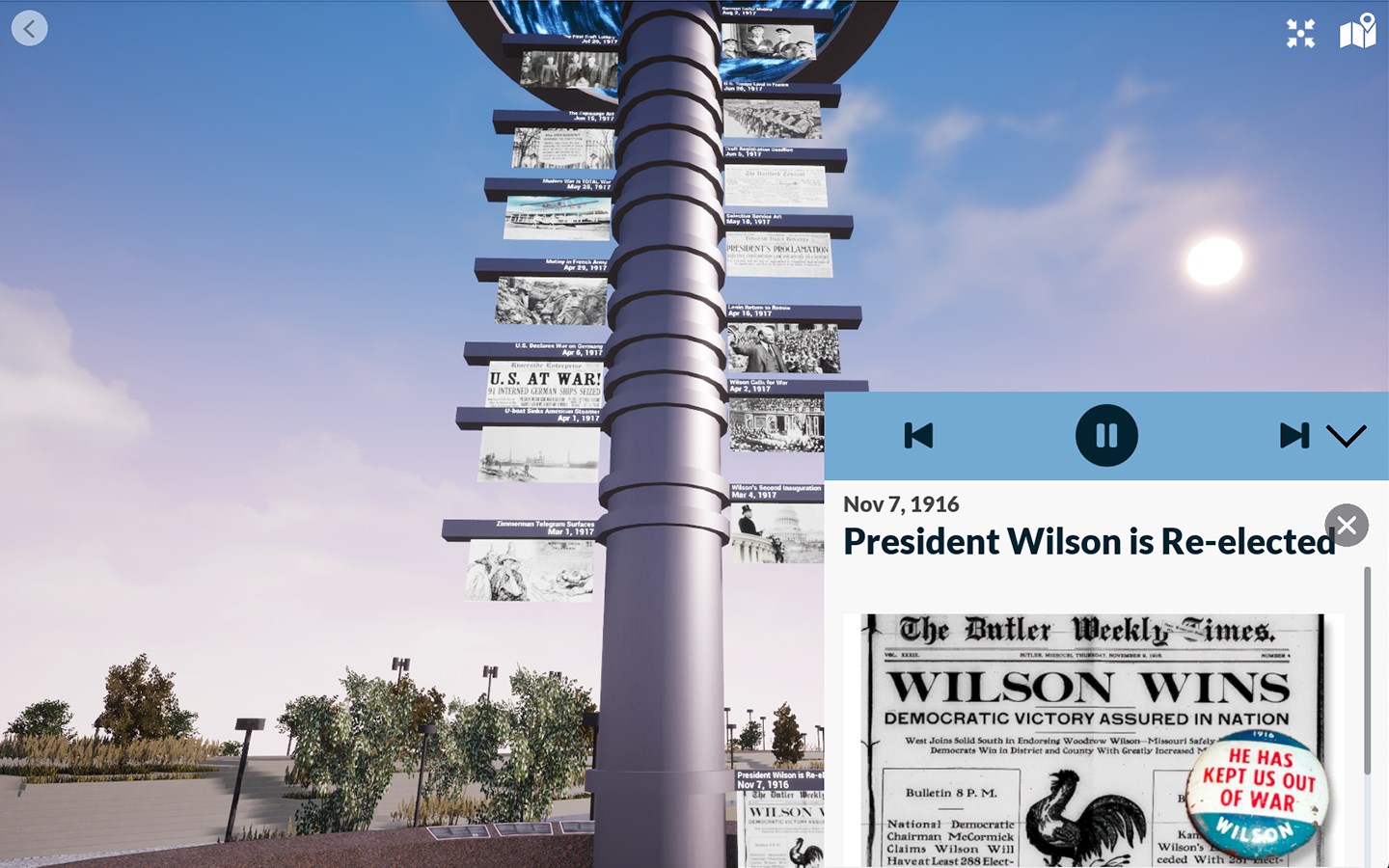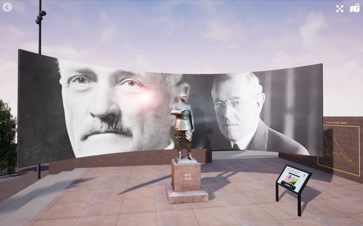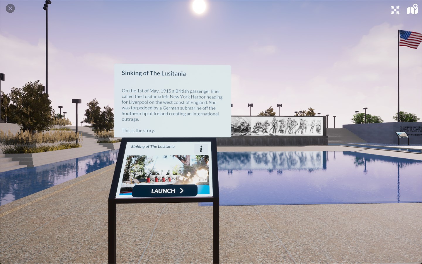 Interactive Virtual Tour: Navigate the 1.7-acre park and explore narrated, interactive audio-visual experiences located throughout the virtual memorial.The Sinking of the Lusitania: Engage with a 3D story where you control the camera, bringing this pivotal event to life.The Vehicles of WWI: Examine detailed models of WWI airplanes, ambulances, tanks, and even a 1917 vintage Harley Davidson.The Timeline Tower: Discover an 80-foot tall virtual timeline featuring 50 key WWI events, each narrated for an in-depth historical understanding of often surprising event relationship.A Soldier\’s Journey narrates the story of the 38-figure, 60-foot long centerpiece bronze sculpture that is completing the WWI Memorial in the fall of 2024.How WWI Changed America: a series of 50 micro documentaries with leading WWI historians that explore the social impacts of WWI on US society.Pershing Legacy of Service: tells the story of General John J. Pershing the commanding General of the Armies in WWI and his family legacy of service.The Genesis of the Modern Tank: How did it gets its name? What role did the tank play in WWI?The King of Battle: What was the most destructive weapon of WWI in an era when warfare became wholesale slaughter?Stories of service: Submit your family WWI Story of Service for others to hear. Comings soon the service records in this feature will grow from a mere 1,000 stories to several HUNDRED THOUSAND. AND MORE...