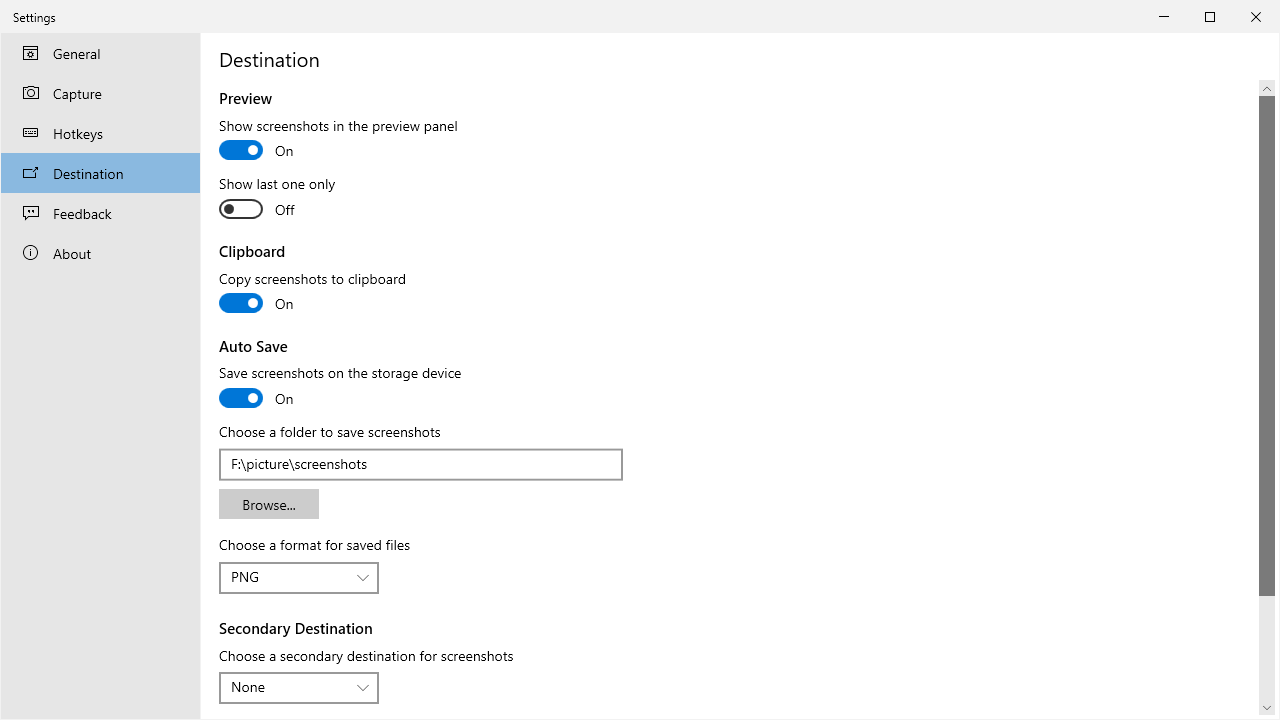 You can choose to save captures to file, copy to clipboard or immediately view and share with other programs using the drag & drop feature.