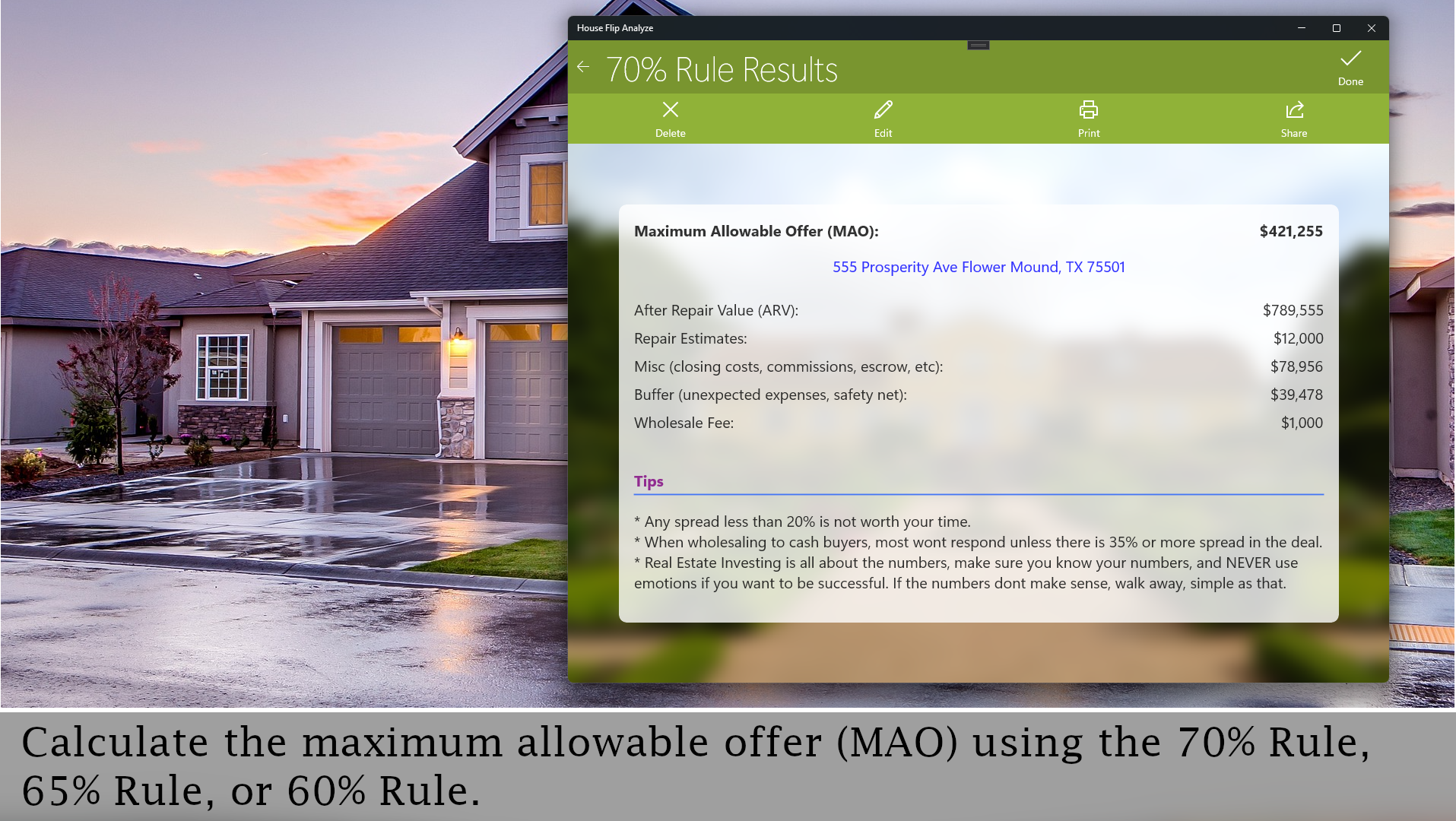 Print out all reports to show banks and partners you mean business.70% Rule Calculator65% Rule Calculator60% Rule CalculatorFix and Flip CalculatorFix and Flip Rehab CalculatorValuable tips on how much spread cash buyers look for in deals.Share your reports to partners, wholesalers, lenders, social media, etc...