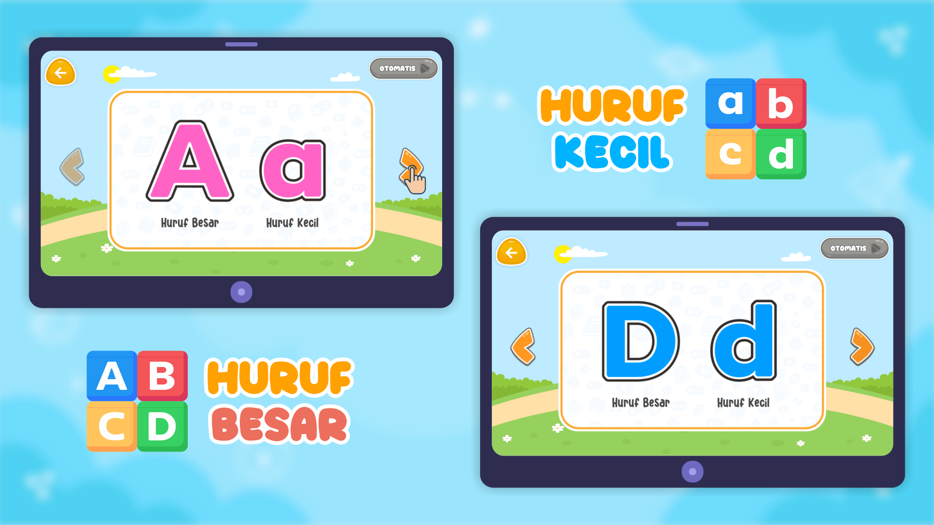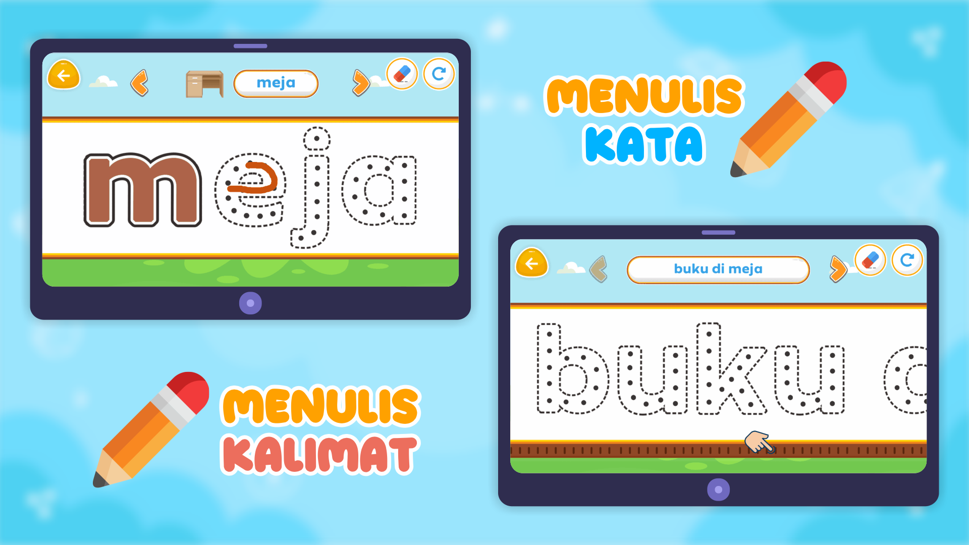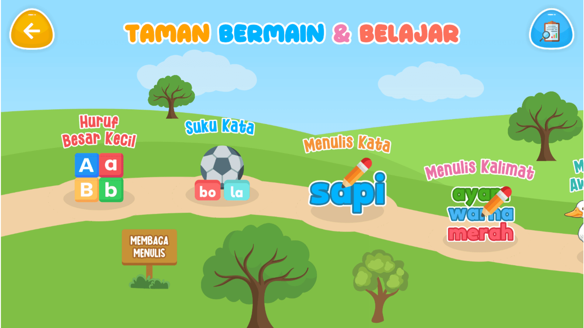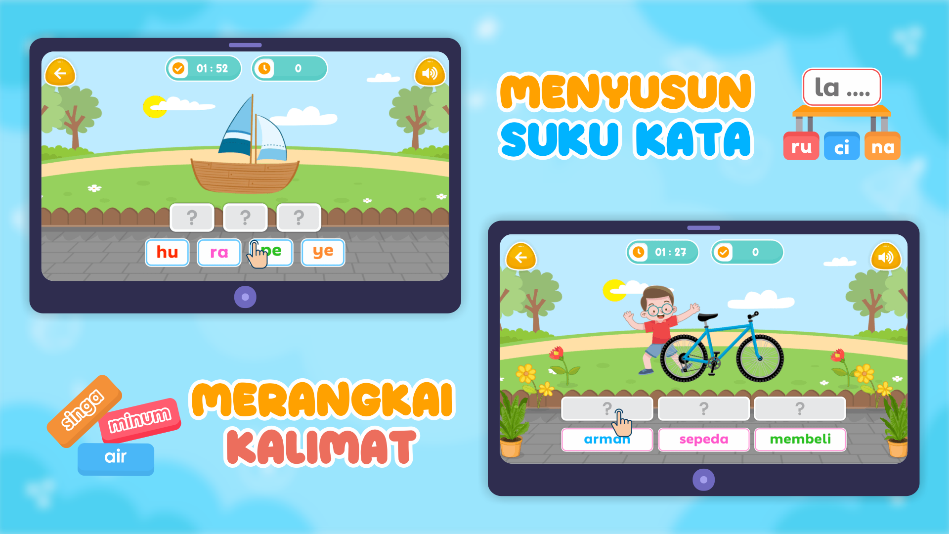 Belajar Mengenal Huruf Kecil & BesarBelajar Suku KataBelajar Menulis KataBelajar Menulis KalimatBermain Mencocokan Awalan HurufBermain Merangkai KataBermain Menyusun Suku KataBermain Merangkai KalimatBelajar Jumlah BendaBelajar PenjumlahanBermain Mengurutkan Angka Kecil ke BesarBermain Mengurutkan Angka Besar ke KecilBermain Menghitung BendaBermain Pasang Angka