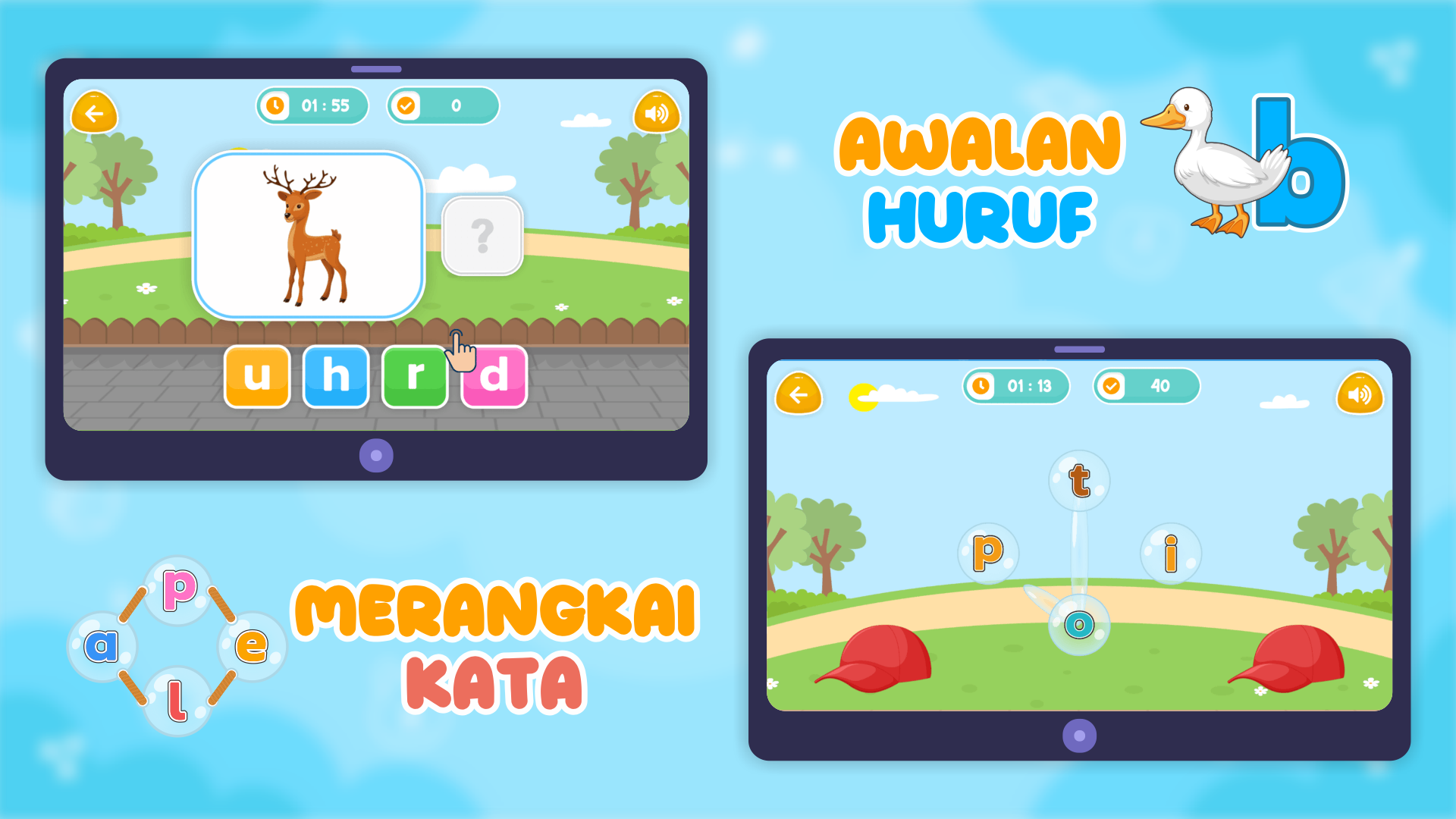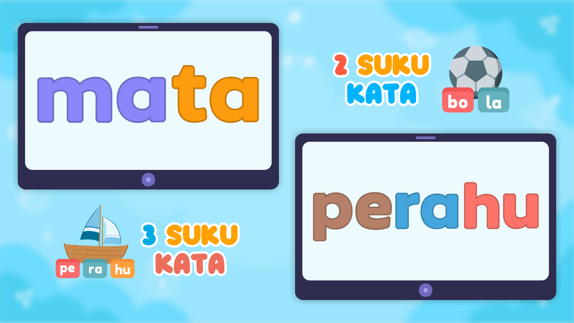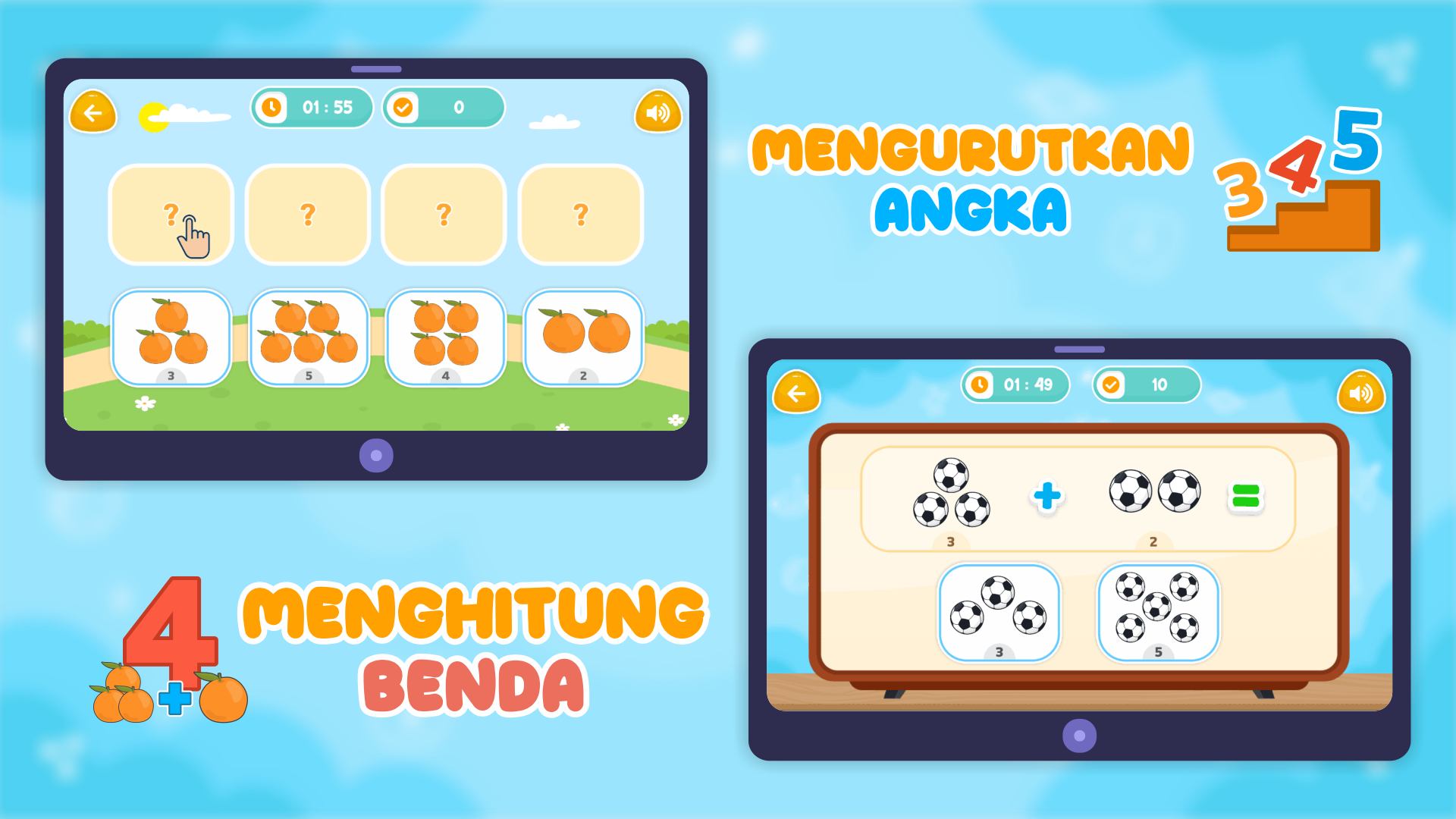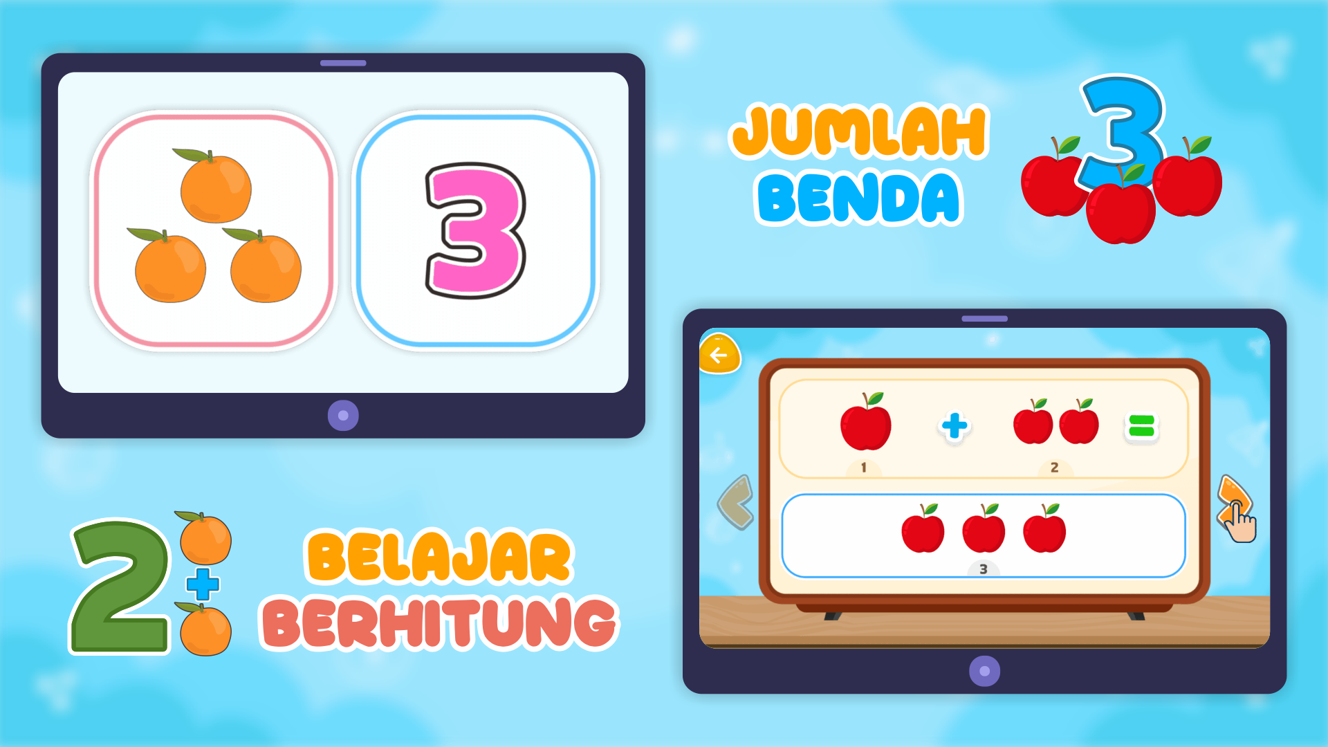 Belajar Mengenal Huruf Kecil & BesarBelajar Suku KataBelajar Menulis KataBelajar Menulis KalimatBermain Mencocokan Awalan HurufBermain Merangkai KataBermain Menyusun Suku KataBermain Merangkai KalimatBelajar Jumlah BendaBelajar PenjumlahanBermain Mengurutkan Angka Kecil ke BesarBermain Mengurutkan Angka Besar ke KecilBermain Menghitung BendaBermain Pasang Angka