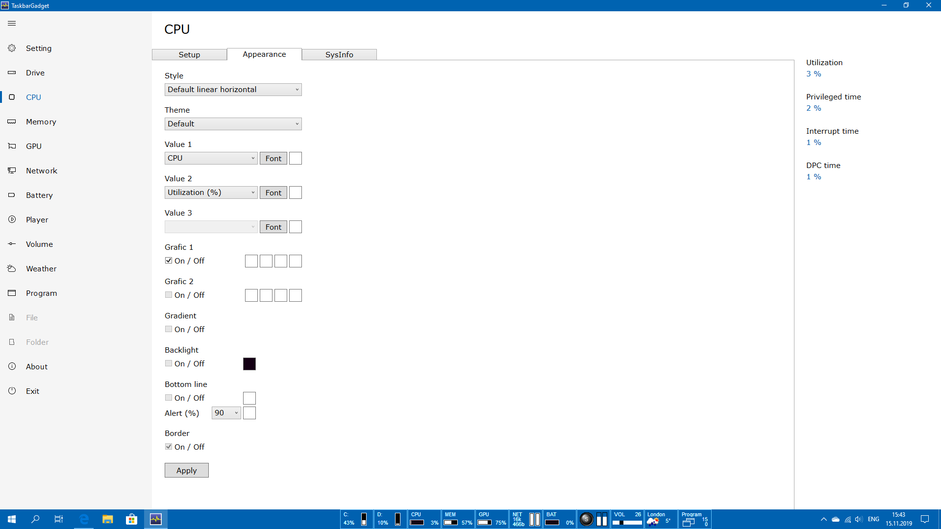 TaskbarGadget - A set of mini-programs on the taskbar offering monitoring of computer parameters HDD & SSD, CPU, RAM, GPU, Network, Battery, Radio, Volume, Weather and providing easy access to numerous functions of Windows OS.