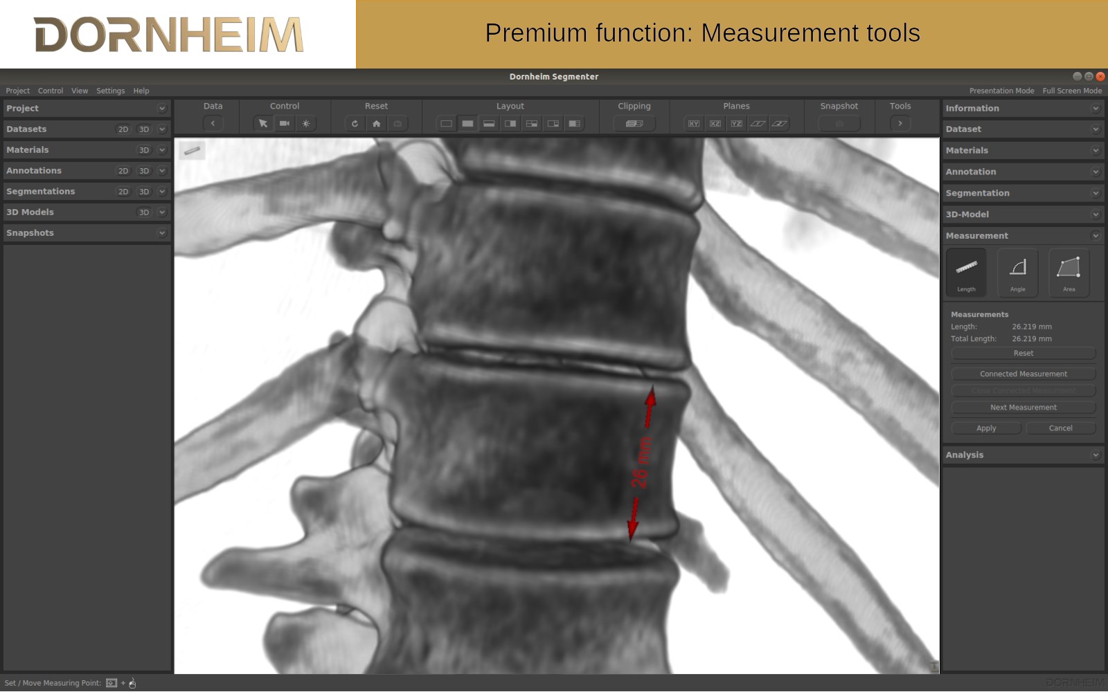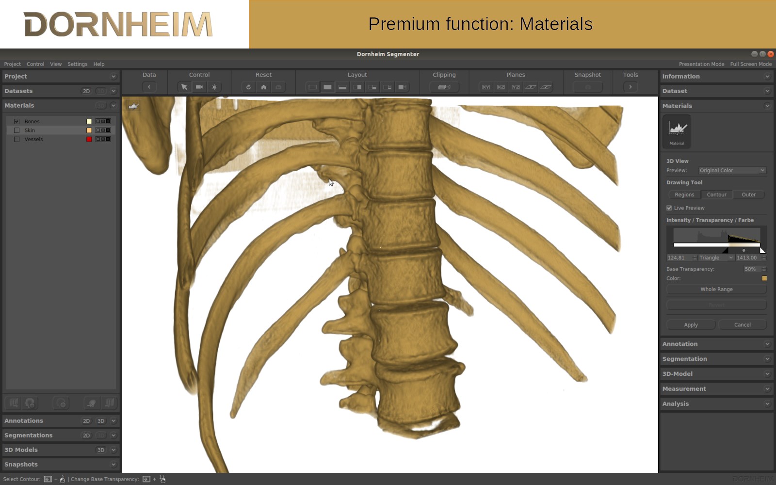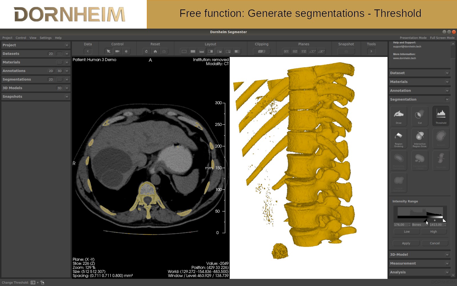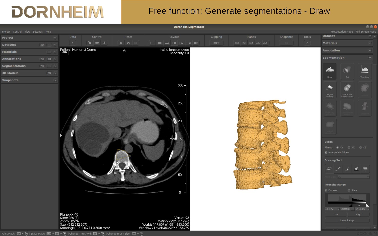 The Dornheim Segmenter is a comfortable application for segmentation of DICOM and 3D voxel data including the corresponding 3D model creation. Various standard tools are available for segmenting the imaging data.