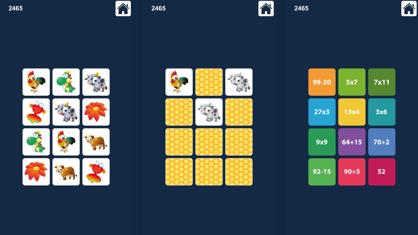 The game is match-up game, concentration game, memorization game, memory game, memory puzzle, math puzzle game, numbers puzzle game, math training game, brain game, pair matching puzzle and educational game to train and improve memorization and concentration. The game is very good choice to spend your free time for adults and kids.