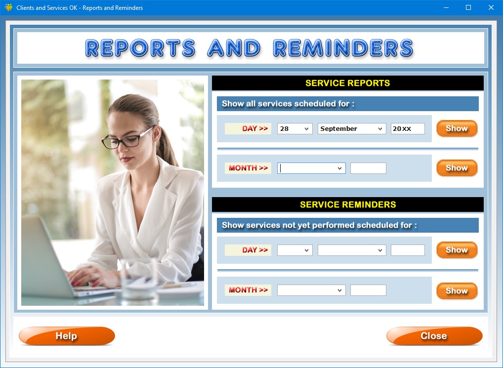 The Reports and Reminders app allows you to get daily and monthly reports and reminders on all the scheduled services you have stored in the annual databases. While a report considers all services of the selected day or month regardless of whether they have been completed or not, a reminder does not consider services that have been marked as performed by ticking the "Service performed" box.