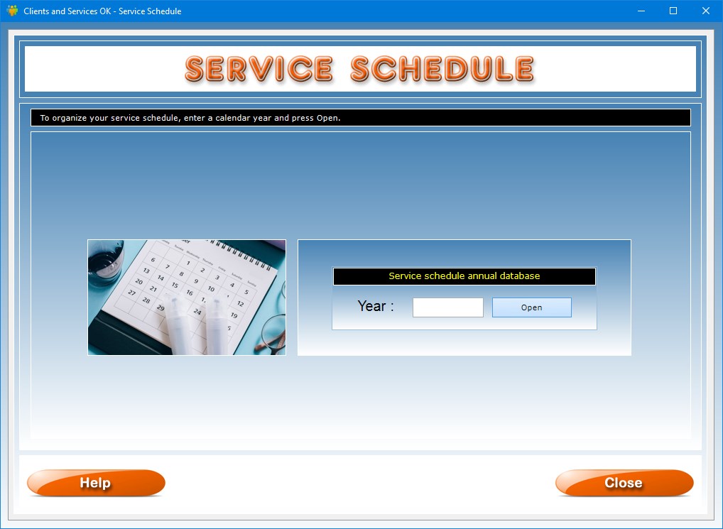 The Service Schedule app allows you to monitor deadlines regarding the appointments you have made with your clients and to be notified when the date arrives through the use of reports and reminders. The deadlines you can manage could concern any type of service you have agreed to provide to your clients or customers, such as consulting, bespoke work, the delivery of a product, and so on. To use this app you need to create a new annual database of scheduled services or open an annual database that you have already created. So, the first operation you need to perform is to select the calendar year of interest and press the Open button.