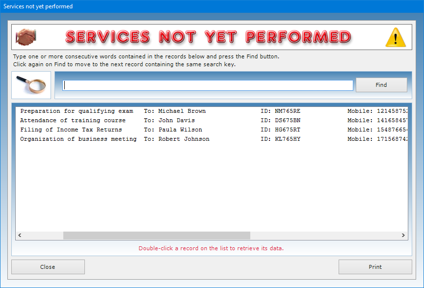 The software allows you to carry out advanced searches in the database even using a partial search key, that is, indicating one or more consecutive words contained in any text field. For each search you can refer to one or more fields at the same time. For example, you can obtain a list of all the clients to whom a particular service will be provided during the year or, conversely, a list of all the services to be provided to a specific client.