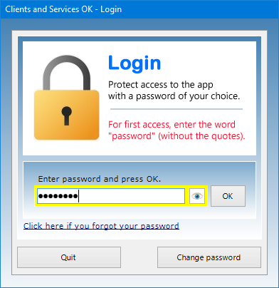 Access to the software is protected by a user-customizable password that can be changed as often as desired. For the first access to the software, you must use the keyword "password" (written without the quotation marks). If you forget your password, send an e-mail to the author of the software at [email protected] using the sentence "Forgot login password for Clients and Services OK" as a subject line. In response to your e-mail, you will receive instructions to reset your password.