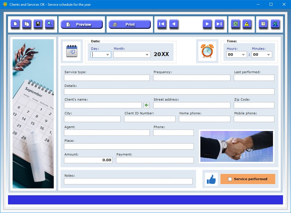 You can describe each scheduled service by indicating the date and time of the deadline or appointment, the service type, its frequency, the last time it was performed, a detailed description of the service, the client's data, the name and phone number of the agent or company representative providing the service, the place of the appointment or where the service will be carried out, the amount to be paid by the client, the method of payment, and any further notes.