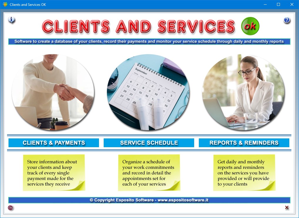 Clients and Services OK is suitable for all categories of professionals, such as accountants, lawyers, labor consultants, doctors, dentists, but also car dealers, mechanics, carpenters, locksmiths, tailors and anyone who needs to keep track of their clients or customers and the services or products they provide. This software program is composed of three interacting apps that allow you to keep track of your clients' information, plan your services by managing a schedule of your appointments with your clients and get detailed reports on all of the services perfomed and amounts received.