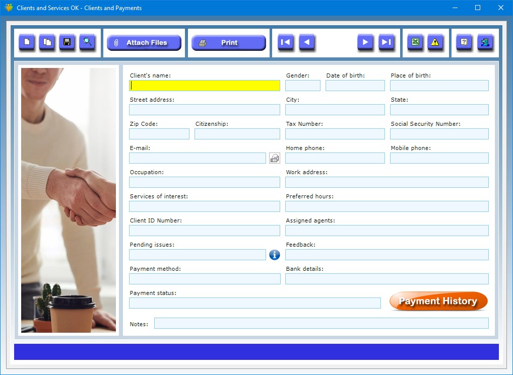 In the Clients and Payments app you can store your clients' data in detail, indicating, of each one, the name, gender, date and place of birth, home address, citizenship, Tax Number, Social Security Number, e-mail address, home and mobile phone numbers, occupation, work address, services of interest, preferred times of the day to be contacted, Client ID Number, assigned agents, any feedback that the client has expressed about the company, payment method, bank details, payment status and any further notes.