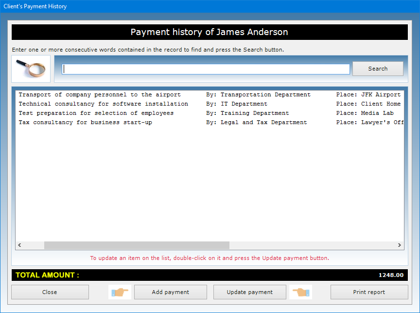 To edit a payment in the list, you need to select it with a click, press the Update payment button, make the desired corrections, additions or deletions in the text fields, press Save and then Close. At the bottom of the list is the total amount paid by the client since he or she started being served by your business.